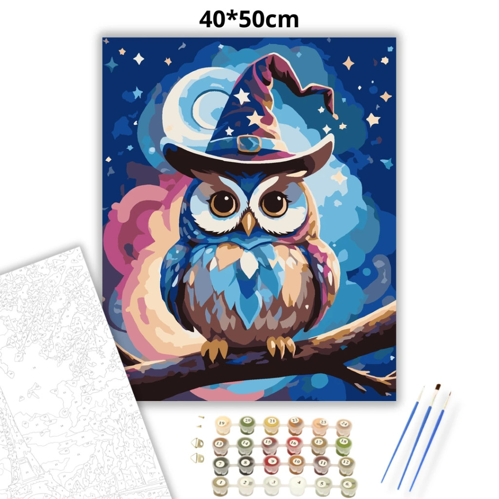 Mesés varázskalapos bagoly - számfestő készlet – 40×50 cm (Keretre feszítve)