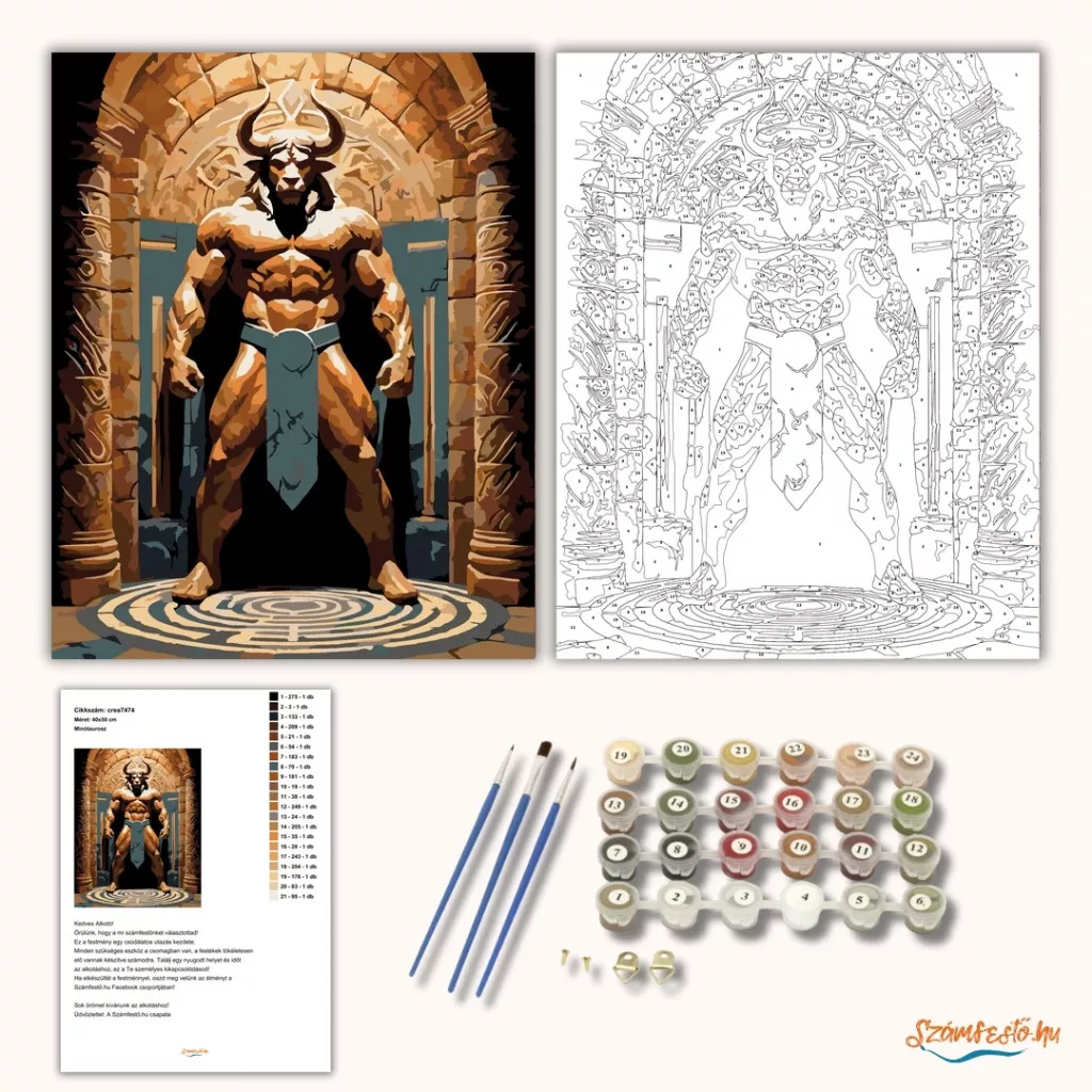 A képen a Minótaurosz áll a labirintus közepén, hatalmas szarvakkal és izmos alakkal. Mögötte faragott kőfalak és boltíves kapu látható, a földön pedig a labirintus mintája. A meleg, fáklyafényes hangulat titokzatos és erőteljes. Díszítsd otthonodat saját kézzel készített műalkotással, vagy ajándékozd meg szeretteidet egy igazán különleges élménnyel! A számfestő készletben minden szükséges eszköz megtalálható a festmény elkészítéséhez.