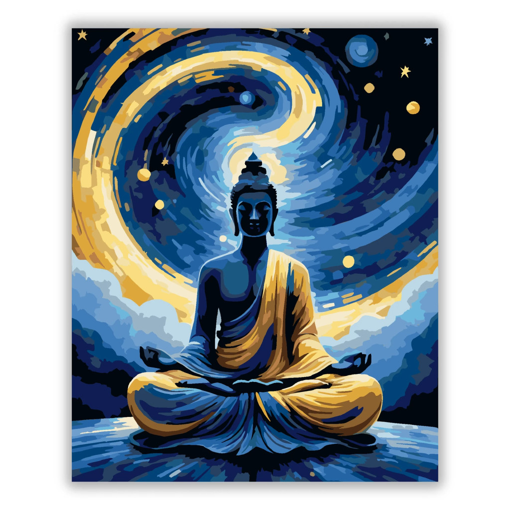A képen egy ülő Buddha alak látható, keresztezett lábakkal, a kezeit a térdén pihentetve. Mögötte örvénylő, csillagokkal és kör alakú égitestekkel teli éjszakai ég jelenik meg. A mély kék és arany árnyalatok nyugodt, misztikus hangulatot teremtenek.