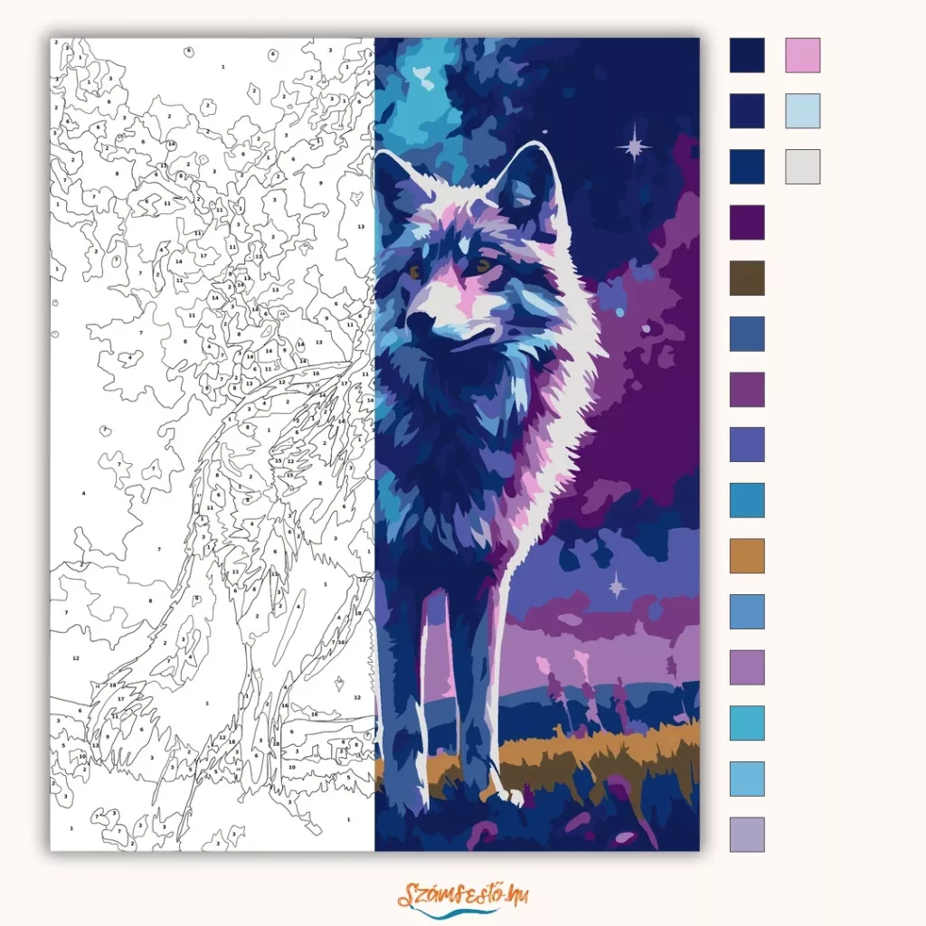 A képen egy farkas áll egy füves területen, a háttérben csillagos égbolttal. A jelenetet erős kék, lila és rózsaszínes árnyalatok uralják, amitől különleges, álomszerű hangulatot kap. A farkas tekintete előre néz, a szőre részletgazdagon rajzolódik ki.