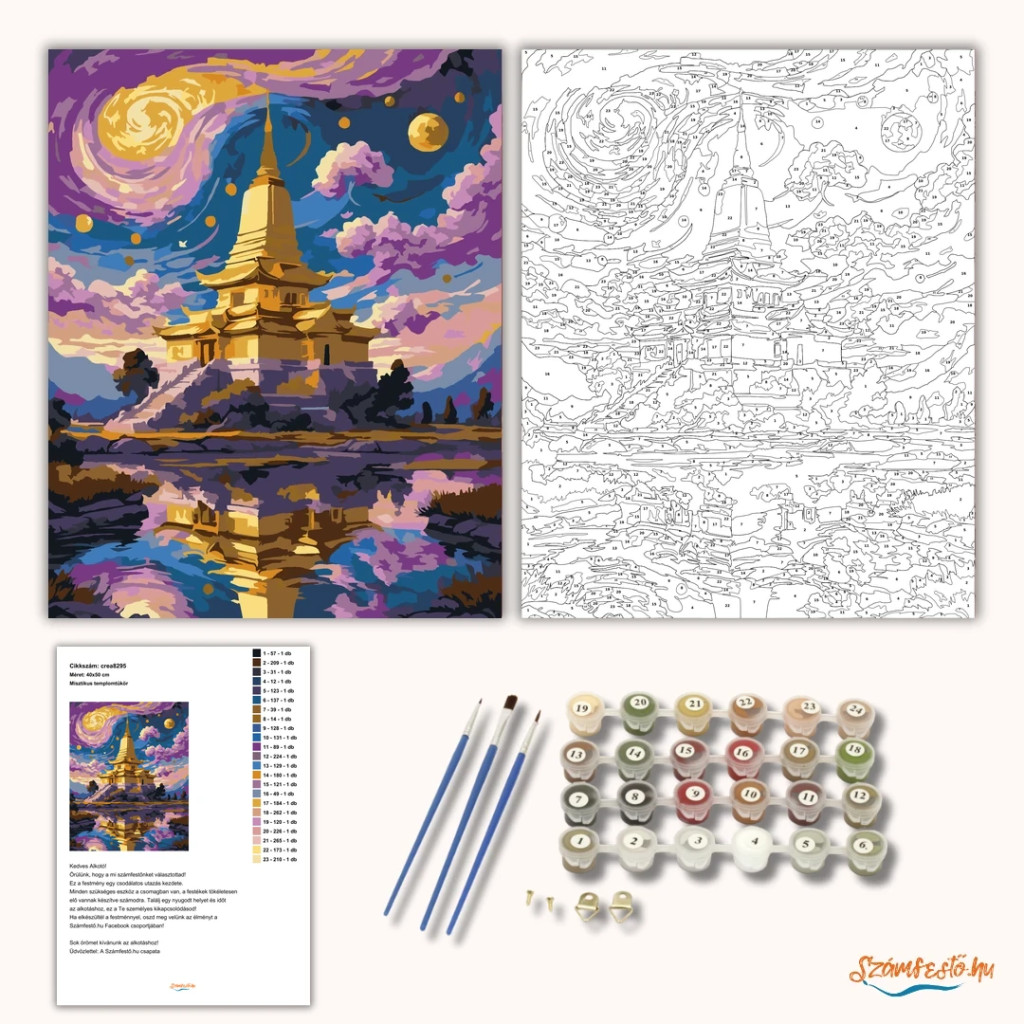 A képen egy aranyszínű templom emelkedi ki, alatta a víztükörben tisztán visszaverődik. Fent örvénylő, lila és arany árnyalatú égbolt, felhők és fénylő égitestek teszik álomszerűvé a látványt. Nyugodt, misztikus hangulatú kép, amely egyszerre hat monumentálisnak és békésnek. Varázsolj egyedi hangulatot otthonodba ezzel a gyönyörű számfestő készlettel, amely tökéletes ajándék is lehet szeretteid számára. A csomag mindent tartalmaz, amire szükséged van ahhoz, hogy saját kezűleg alkoss egy lenyűgöző festményt.