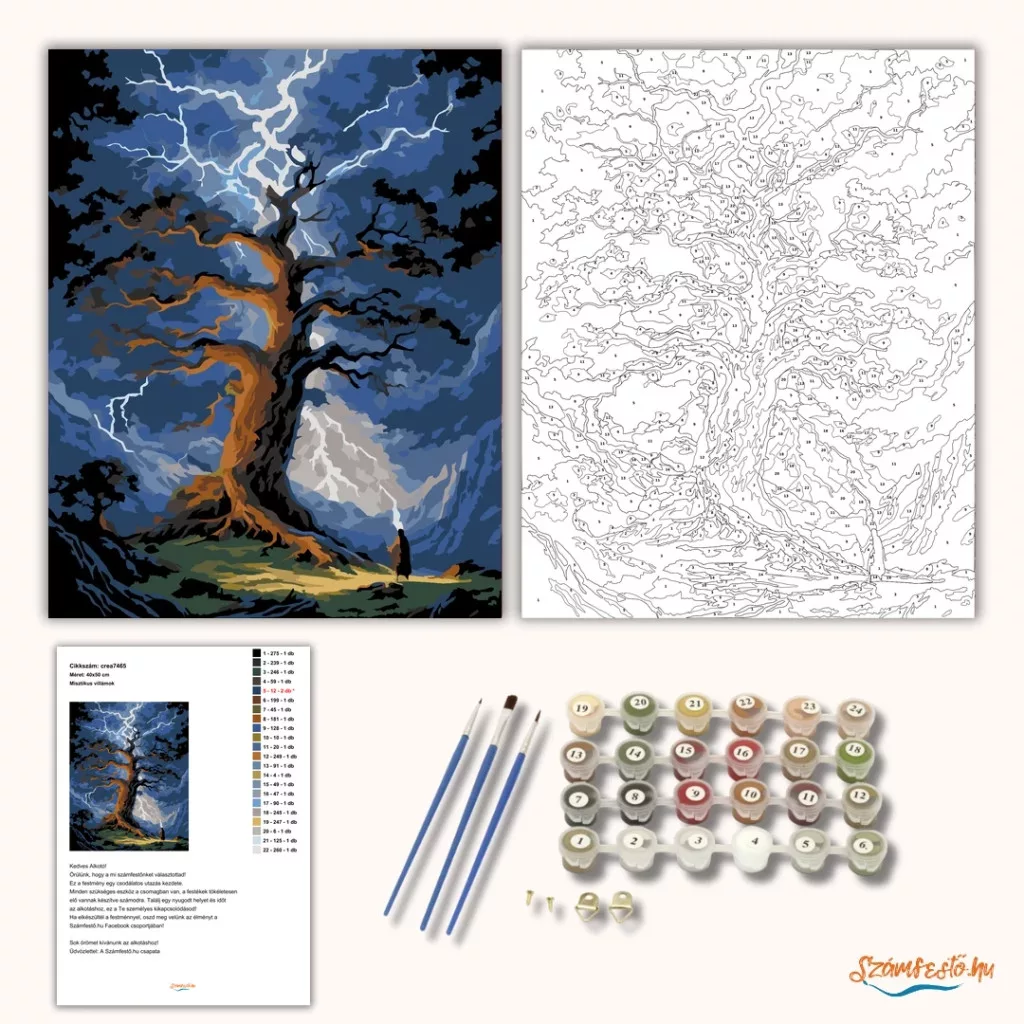A képen egy vihar tépázta tisztáson álló hatalmas, ősi tölgy látható, fölötte cikázó villámokkal. A fa mellett egy magányos alak áll, karját felemelve, mintha a villámokat idézné. A sötét, kékes felhők és a vakító fények drámai, misztikus hangulatot teremtenek. Engedd szabadjára a kreativitásodat, és alkoss egy különleges műalkotást, amely otthonod dísze lehet de egyedi ajándékként is kiváló. A számfestő készletben minden szükséges eszközt megtalálsz a tökéletes végeredményhez.