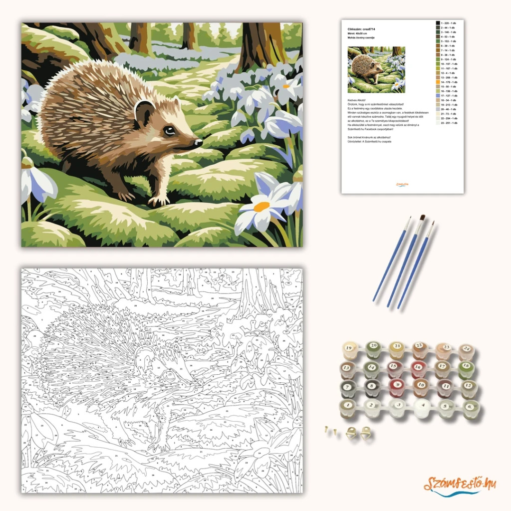 A képen egy kis sün sétál lassan egy mohás erdei ösvényen, a növények között megbújva. Körülötte tavaszi virágok nyílnak, és a fák között lágy fény szűrődik át. A látvány nyugodt, természetközeli hangulatot áraszt. Legyen a lakásod dísze vagy egy kedves meglepetés valaki számára – ez a számfestő készlet tökéletes választás mindkettőre. A készletben mindent megtalálsz, amivel lépésről lépésre megalkotható ez a gyönyörű festmény.