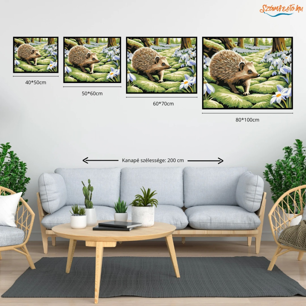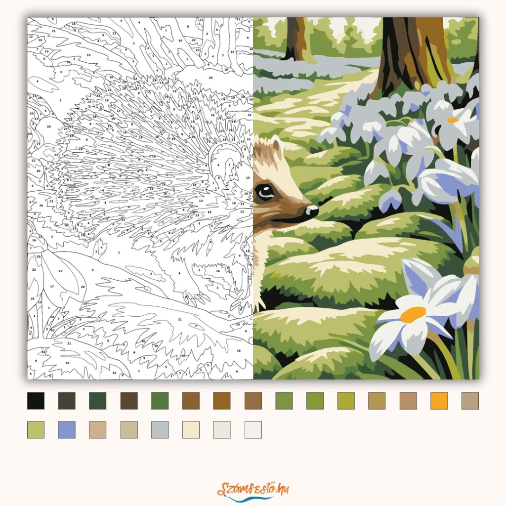 A képen egy kis sün sétál lassan egy mohás erdei ösvényen, a növények között megbújva. Körülötte tavaszi virágok nyílnak, és a fák között lágy fény szűrődik át. A látvány nyugodt, természetközeli hangulatot áraszt. Díszítsd otthonodat saját kézzel készített műalkotással, vagy ajándékozd meg szeretteidet egy igazán különleges élménnyel! A számfestő készletben minden szükséges eszköz megtalálható a festmény elkészítéséhez.