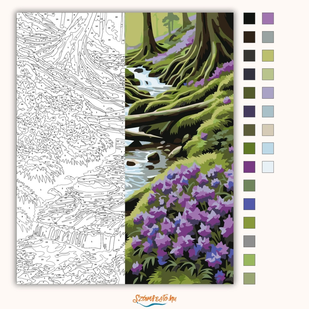 A képen egy hegyi erdőben kanyargó patak látható, amely egy sekély vízmosáson fut végig a mohos partok között. A víz köveken csillan, a partokat lila vadvirágok és erős gyökerek szegélyezik. Friss, tavaszi hangulatú látvány, nyugodt, természetközeli atmoszférával. Legyen a lakásod dísze vagy egy kedves meglepetés valaki számára – ez a számfestő készlet tökéletes választás mindkettőre. A készletben mindent megtalálsz, amivel lépésről lépésre megalkotható ez a gyönyörű festmény.