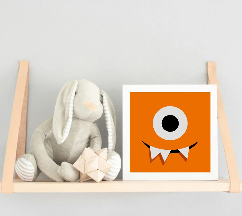 Ezen a képen egy mókás, egyszemű narancssárga szörnyecske mosolyog rád. A nagy szem és a két fehér, hegyes fog igazán játékos hangulatot ad. A narancssárga, fehér és fekete színek dominálnak.