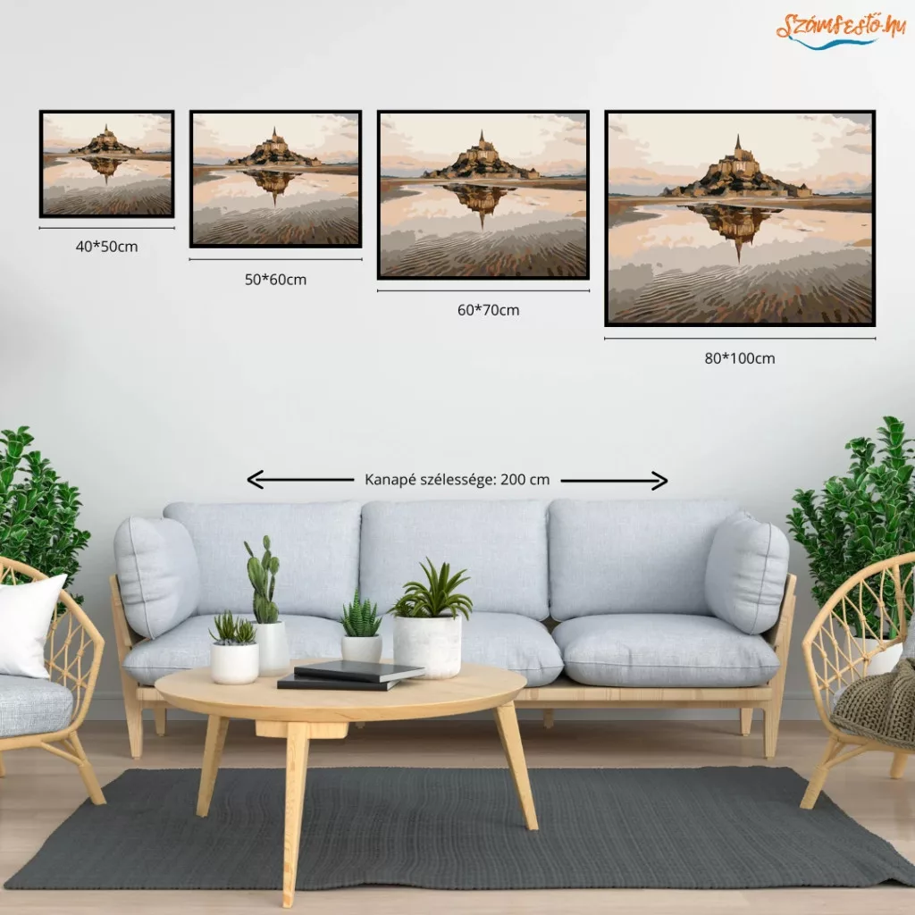 A képen a Mont Saint-Michel sziklás szigete látható, a tetején magasodó apátsággal és tornyokkal. Az alacsony vízállásban a tükörsima víz visszaveri az épületeket, a távolban pedig lágy felhők keretezik a látványt. Nyugodt, időtlen hangulatú kép, természetes földszínekkel és finom fényekkel. Varázsolj egyedi hangulatot otthonodba ezzel a gyönyörű számfestő készlettel, amely tökéletes ajándék is lehet szeretteid számára. A csomag mindent tartalmaz, amire szükséged van ahhoz, hogy saját kezűleg alkoss egy lenyűgöző festményt.
