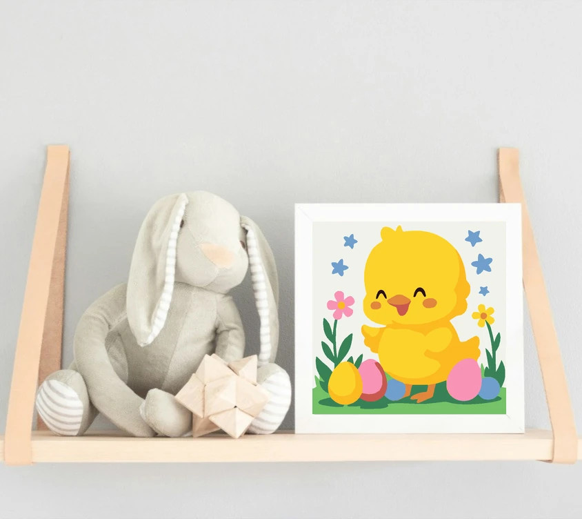 Ezen a képen egy mosolygós kiscsibe áll a fűben, körülötte húsvéti tojásokkal és virágokkal. A sárga csibe mellett a rózsaszín, kék és sárga tojások is jól látszanak. A zöld levelek és a kék csillagok vidám tavaszi hangulatot adnak. Varázsolj egyedi hangulatot otthonodba ezzel a gyönyörű számfestő készlettel, amely tökéletes ajándék is lehet szeretteid számára. A csomag mindent tartalmaz, amire szükséged van ahhoz, hogy saját kezűleg alkoss egy lenyűgöző festményt.