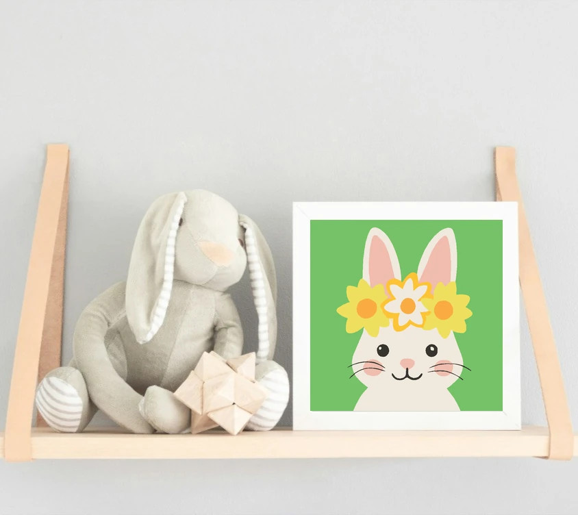 Ez a kedves nyuszi portré virágkoszorút visel a fején, és vidáman mosolyog. A sárga-fehér virágok szépen kiemelkednek a zöld háttérből. Remek választás kis művészeknek, akik szeretik az állatokat! Varázsolj egyedi hangulatot otthonodba ezzel a gyönyörű számfestő készlettel, amely tökéletes ajándék is lehet szeretteid számára. A csomag mindent tartalmaz, amire szükséged van ahhoz, hogy saját kezűleg alkoss egy lenyűgöző festményt.