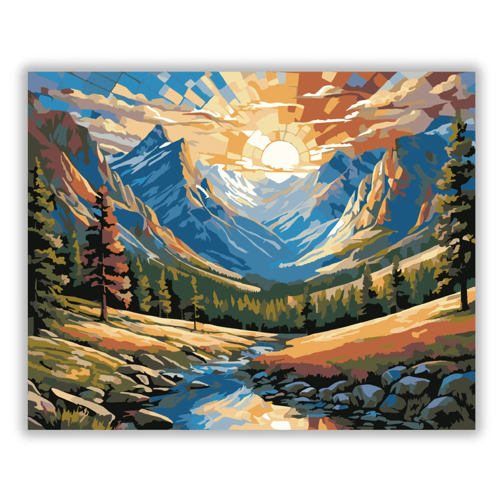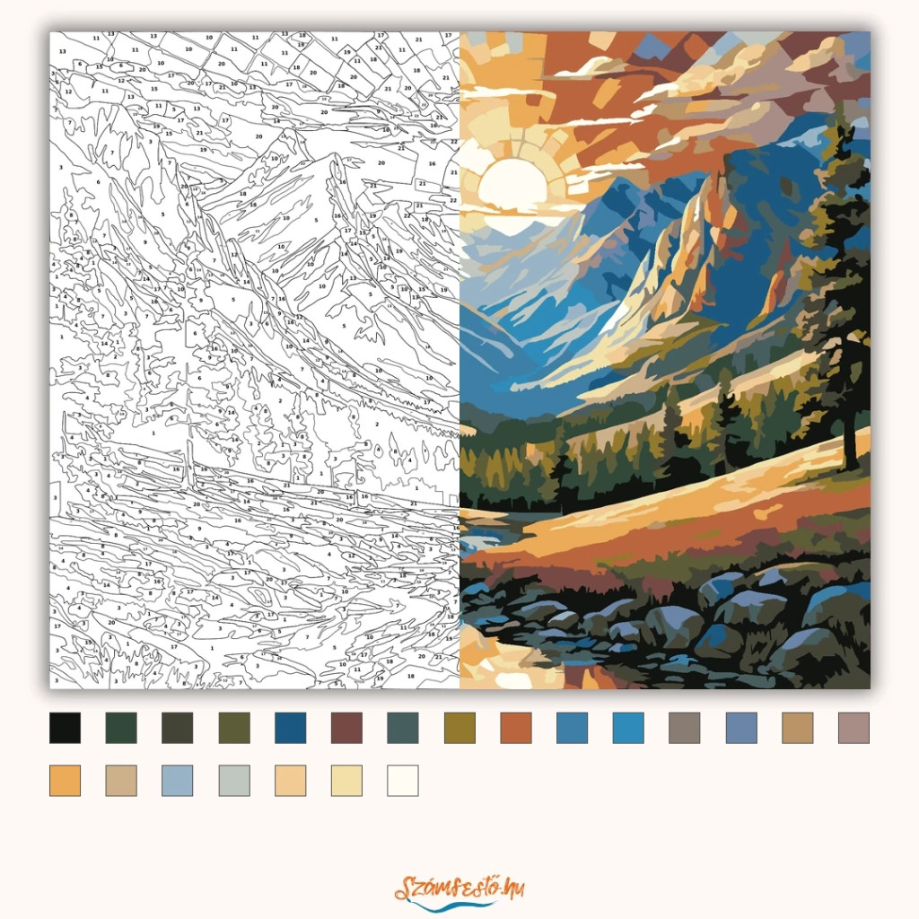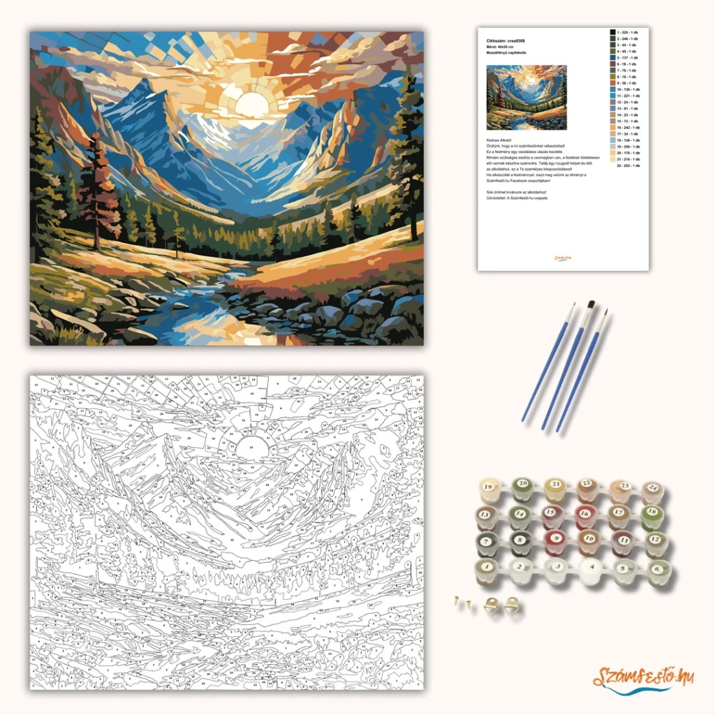 A képen egy hegyekkel körülölelt völgy látható, ahol a felkelő nap fénye mozaikszerűen szóródik szét az égen. A fenyőerdőn át egy patak kanyarog a köves partok között, nyugodt, friss hegyi hangulatot árasztva. A ragyogó fények és a gazdag színek különleges, üvegablakra emlékeztető látványt adnak. Legyen a lakásod dísze vagy egy kedves meglepetés valaki számára – ez a számfestő készlet tökéletes választás mindkettőre. A készletben mindent megtalálsz, amivel lépésről lépésre megalkotható ez a gyönyörű festmény.