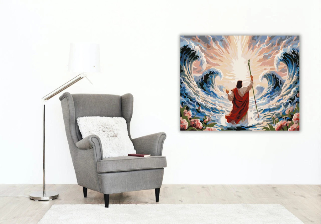 A képen Mózes látható, amint bottal a kezében a kettéváló tenger előtt áll. A két oldalt felcsapó hullámok között erős, ragyogó fény nyílik az égen. A jelenet drámai és felemelő, a kék víz és a meleg fények látványa igazán látványos. Díszítsd otthonodat saját kézzel készített műalkotással, vagy ajándékozd meg szeretteidet egy igazán különleges élménnyel! A számfestő készletben minden szükséges eszköz megtalálható a festmény elkészítéséhez.