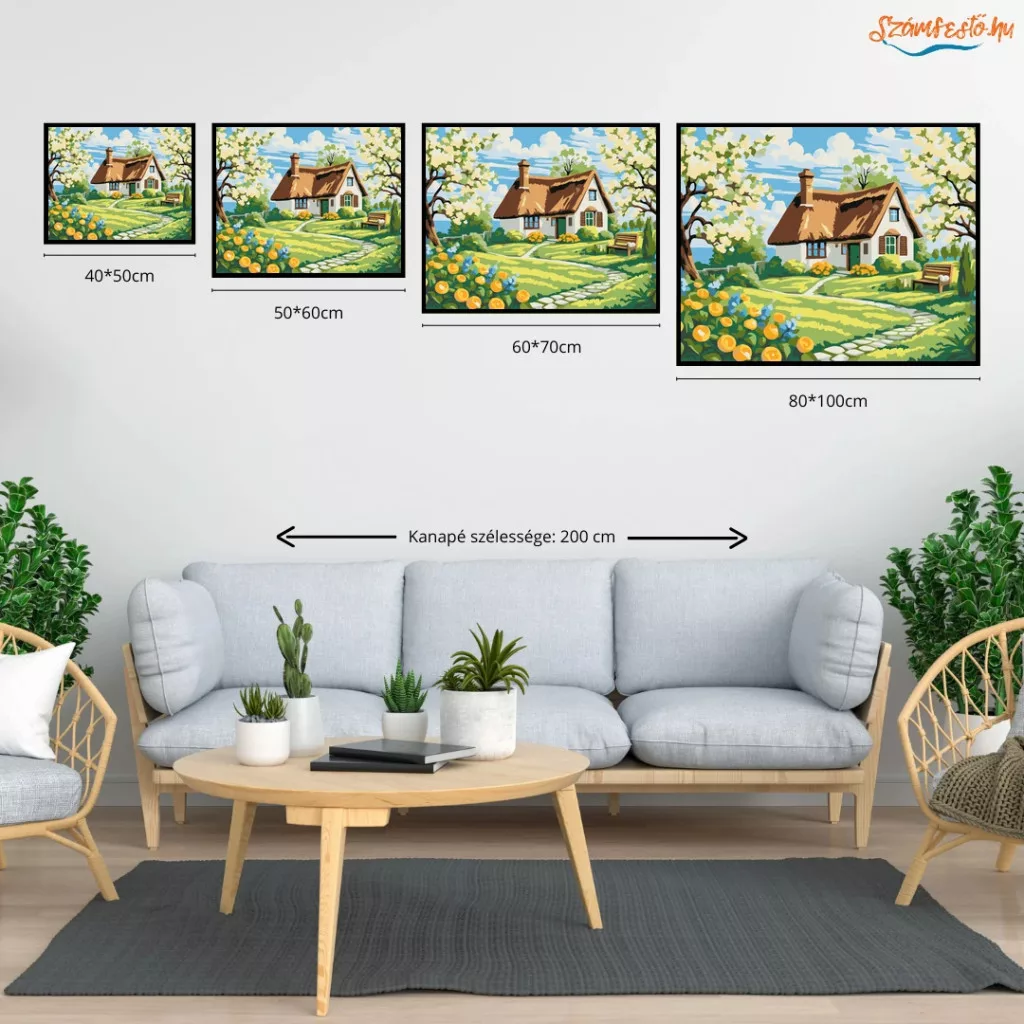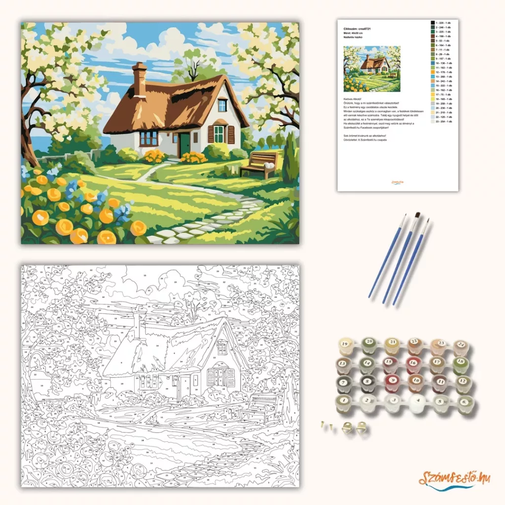 A képen egy békés, nádtetős kis ház látható, virágzó gyümölcsfák és gondozott kert ölelésében. A kanyargó kerti ösvény a bejárathoz vezet, a közelben pad és virágágyások teszik otthonossá a látványt. A friss tavaszi hangulatot a világos égbolt és a sok fehér virág koronázza meg. Legyen a lakásod dísze vagy egy kedves meglepetés valaki számára – ez a számfestő készlet tökéletes választás mindkettőre. A készletben mindent megtalálsz, amivel lépésről lépésre megalkotható ez a gyönyörű festmény.