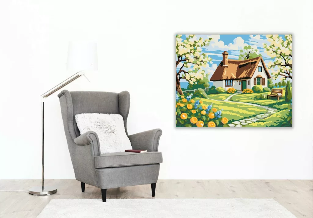 A képen egy békés, nádtetős kis ház látható, virágzó gyümölcsfák és gondozott kert ölelésében. A kanyargó kerti ösvény a bejárathoz vezet, a közelben pad és virágágyások teszik otthonossá a látványt. A friss tavaszi hangulatot a világos égbolt és a sok fehér virág koronázza meg. Díszítsd otthonodat saját kézzel készített műalkotással, vagy ajándékozd meg szeretteidet egy igazán különleges élménnyel! A számfestő készletben minden szükséges eszköz megtalálható a festmény elkészítéséhez.