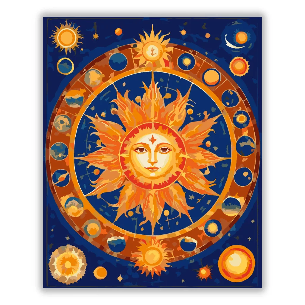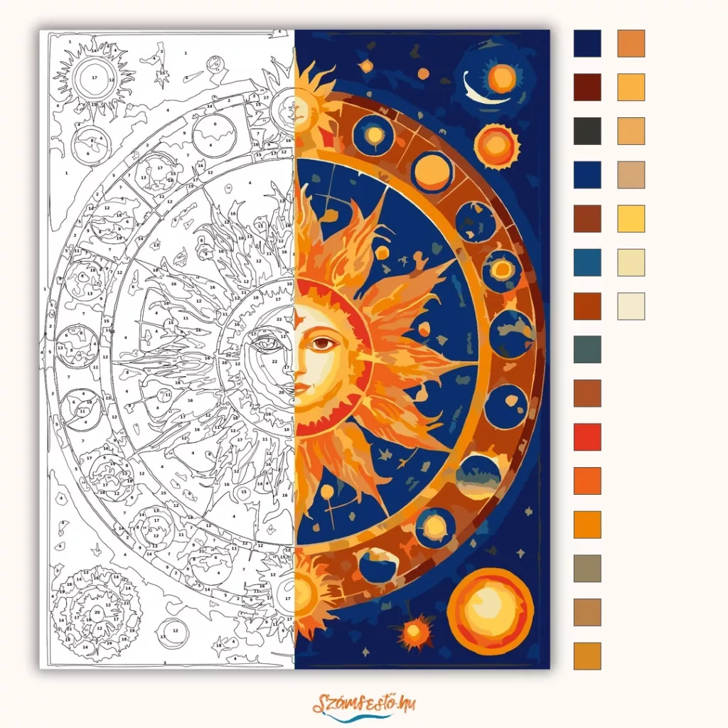 A képen a Nap ragyogó középpontként jelenik meg egy asztrológiai körben, körülötte apró égitestekkel és jelképekkel. A napsugarak sziromszerűen nyúlnak kifelé, miközben a háttérben csillagok és egy holdsarló látható. A mély, éjszakai kék és a meleg arany tónusok különleges, misztikus hangulatot teremtenek. Legyen a lakásod dísze vagy egy kedves meglepetés valaki számára – ez a számfestő készlet tökéletes választás mindkettőre. A készletben mindent megtalálsz, amivel lépésről lépésre megalkotható ez a gyönyörű festmény.