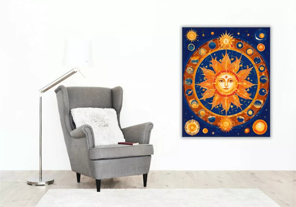 A képen a Nap ragyogó középpontként jelenik meg egy asztrológiai körben, körülötte apró égitestekkel és jelképekkel. A napsugarak sziromszerűen nyúlnak kifelé, miközben a háttérben csillagok és egy holdsarló látható. A mély, éjszakai kék és a meleg arany tónusok különleges, misztikus hangulatot teremtenek. Legyen a lakásod dísze vagy egy kedves meglepetés valaki számára – ez a számfestő készlet tökéletes választás mindkettőre. A készletben mindent megtalálsz, amivel lépésről lépésre megalkotható ez a gyönyörű festmény.