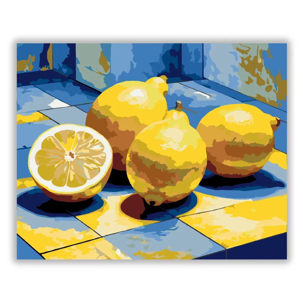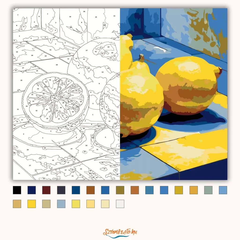 A képen négy citrom látható egy kék mintás felületen, köztük egy félbevágott darabbal. A fényes sárga gyümölcsök erős árnyékot vetnek, így a látvány élénk és friss. A háttér kék árnyalatai és a citromok kontrasztja vidám, nyárias hangulatot ad. Engedd szabadjára a kreativitásodat, és alkoss egy különleges műalkotást, amely otthonod dísze lehet de egyedi ajándékként is kiváló. A számfestő készletben minden szükséges eszközt megtalálsz a tökéletes végeredményhez.