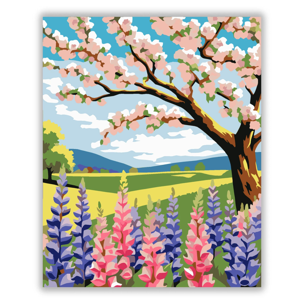 A képen egy virágzó cseresznyefa ága borul a tavaszi táj fölé, alatta rózsaszín és lila csillagfürtök nyílnak. A háttérben dombok és napfényes mezők láthatók, kék égbolttal és fehér felhőkkel. Friss, derűs hangulatú kép, lágy pasztelles és élénk színekkel. Ez a számfestő készlet tökéletes választás, ha egyedi dekorációval tennéd szebbé otthonodat, vagy ha különleges ajándékot keresel. A csomagban minden megtalálható, amire a festéshez szükséged van.