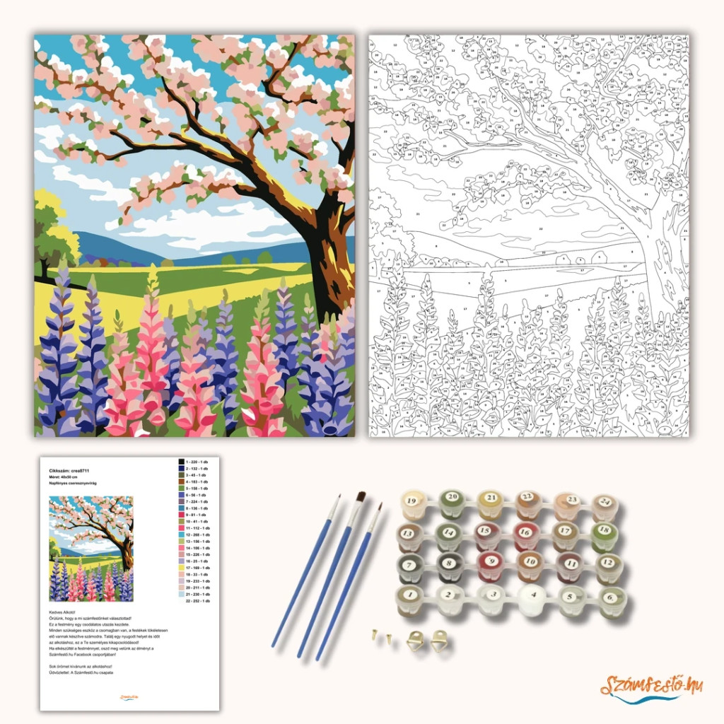 A képen egy virágzó cseresznyefa ága borul a tavaszi táj fölé, alatta rózsaszín és lila csillagfürtök nyílnak. A háttérben dombok és napfényes mezők láthatók, kék égbolttal és fehér felhőkkel. Friss, derűs hangulatú kép, lágy pasztelles és élénk színekkel. Ez a számfestő készlet tökéletes választás, ha egyedi dekorációval tennéd szebbé otthonodat, vagy ha különleges ajándékot keresel. A csomagban minden megtalálható, amire a festéshez szükséged van.