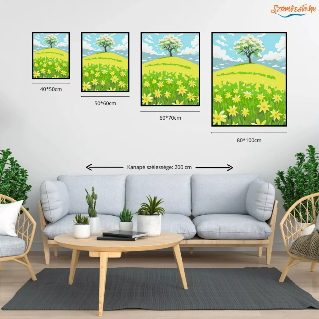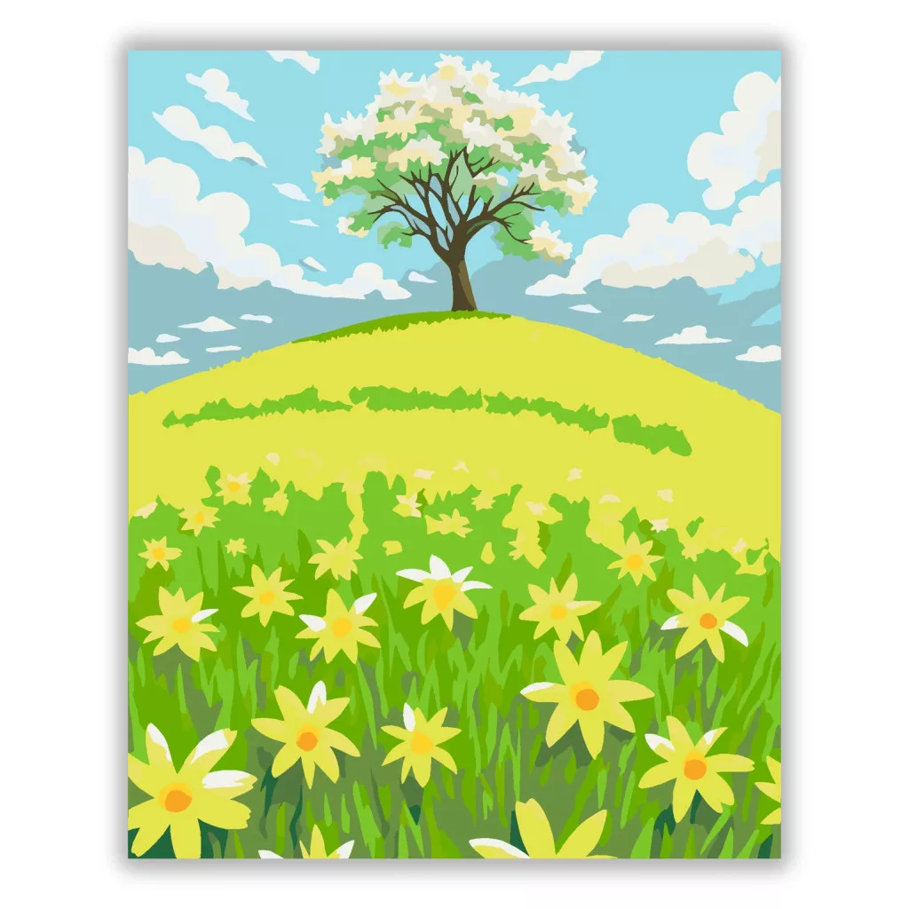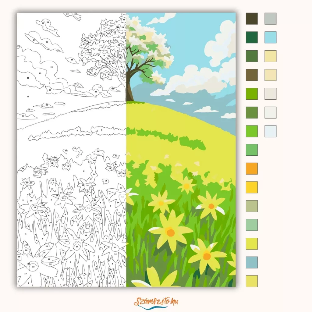 A képen egy tavaszi, virágokkal teli domboldal látható, a tetején egy fehér virágú fával. Előtérben sárga és fehér virágok nyílnak a magas fűben. A kék ég és a puha felhők nyugodt, derűs hangulatot adnak a látványnak. Engedd szabadjára a kreativitásodat, és alkoss egy különleges műalkotást, amely otthonod dísze lehet de egyedi ajándékként is kiváló. A számfestő készletben minden szükséges eszközt megtalálsz a tökéletes végeredményhez.