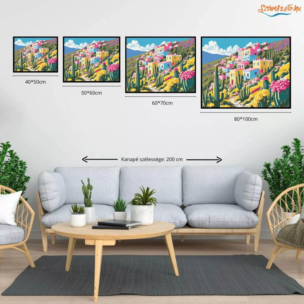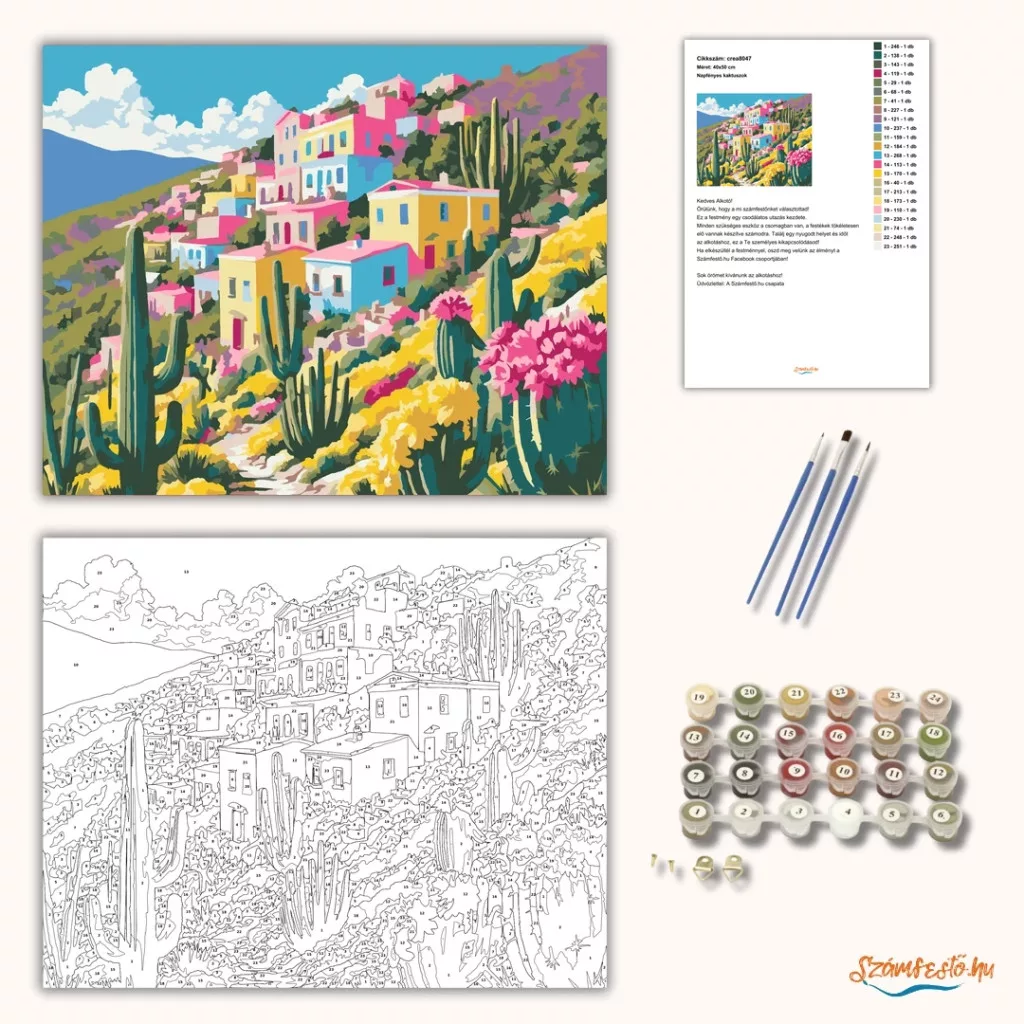 A képen egy domboldalra épült falurészlet látható, sok színes házzal. A lejtőkön nagy kaktuszok és bokrok között kanyargó ösvény vezet. A távolban hegyek és gomolyfelhők teszik légies, nyári hangulatúvá a látványt. Varázsolj egyedi hangulatot otthonodba ezzel a gyönyörű számfestő készlettel, amely tökéletes ajándék is lehet szeretteid számára. A csomag mindent tartalmaz, amire szükséged van ahhoz, hogy saját kezűleg alkoss egy lenyűgöző festményt.