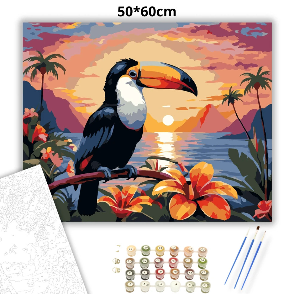 Naplementés tukán - számfestő készlet - Számfestő.hu - 50×60cm - Keretre feszítve