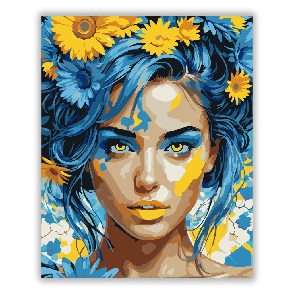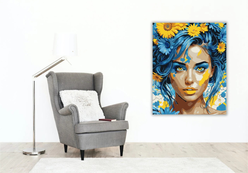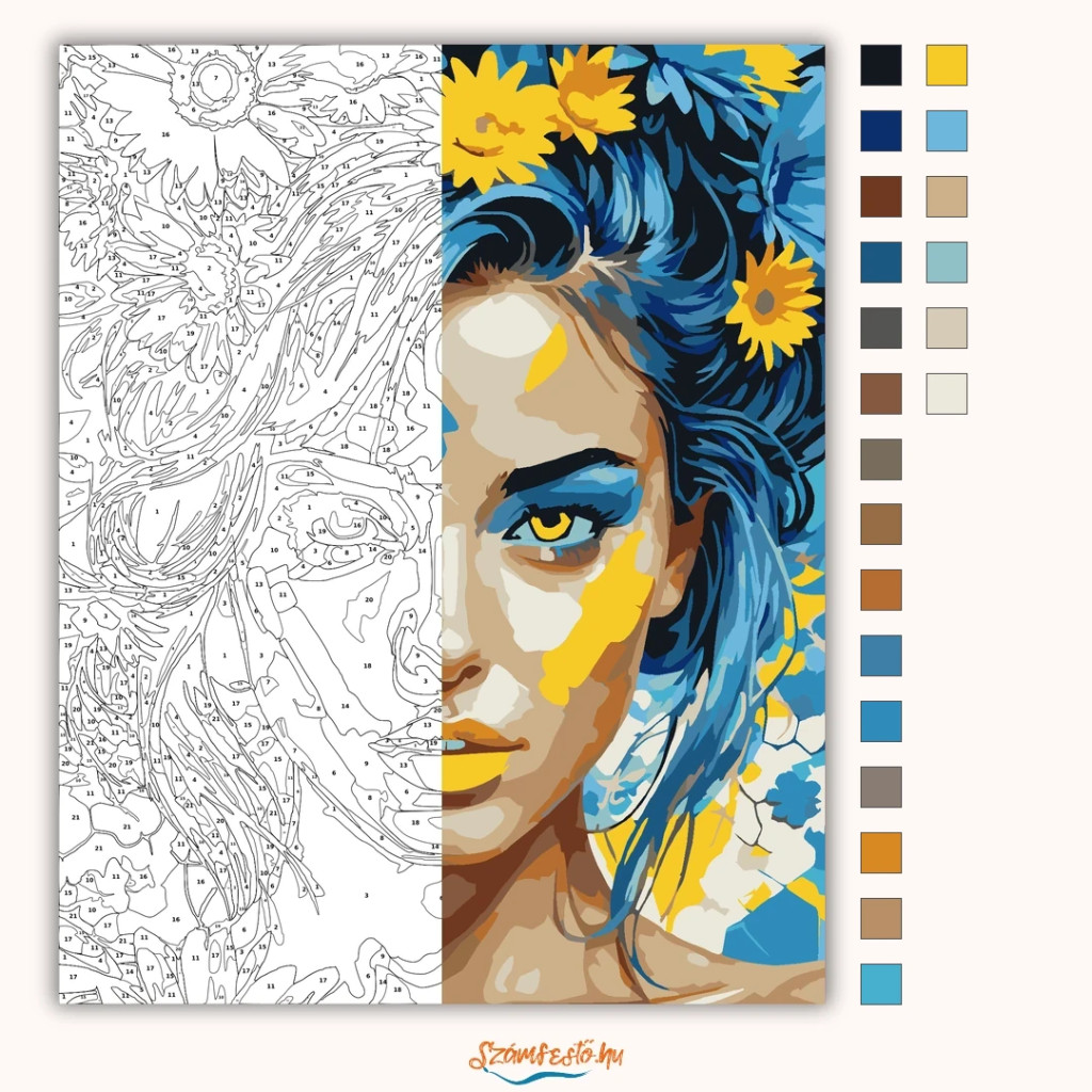 A képen egy női arc látható, élénk kék hajjal és sárga szemekkel. A hajában és körülötte nagy, sárga és kék virágok jelennek meg. A határozott színek és a virágos keret energikus, figyelemfelkeltő hangulatot adnak. Legyen a lakásod dísze vagy egy kedves meglepetés valaki számára – ez a számfestő készlet tökéletes választás mindkettőre. A készletben mindent megtalálsz, amivel lépésről lépésre megalkotható ez a gyönyörű festmény.