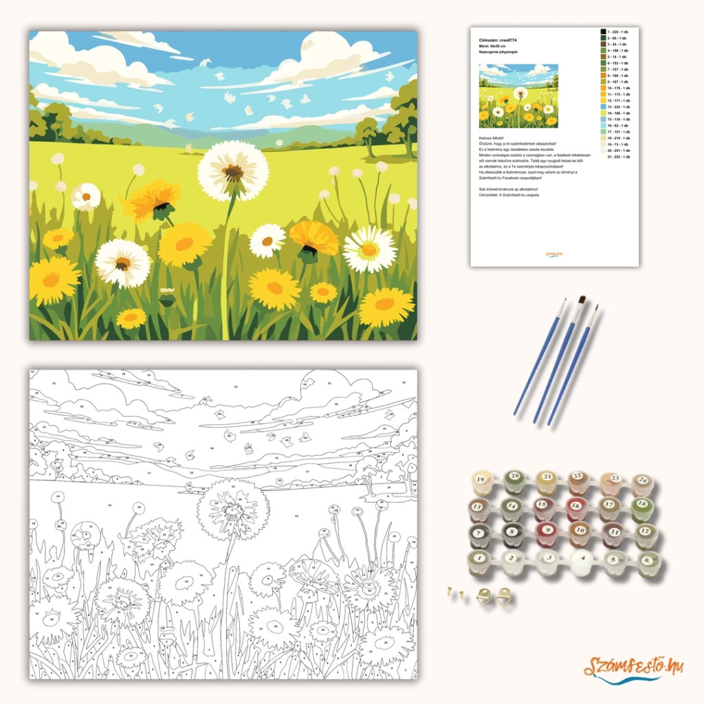 A képen tavaszi rét látható, tele élénk sárga pitypangokkal és fehér, bóbitás virágfejekkel. A háttérben dombok és fák húzódnak, felettük felhős, derűs ég. Friss, könnyed hangulatú látvány, ami a napsütéses mezők érzését hozza el az otthonodba. Ez a számfestő készlet tökéletes választás, ha egyedi dekorációval tennéd szebbé otthonodat, vagy ha különleges ajándékot keresel. A csomagban minden megtalálható, amire a festéshez szükséged van.