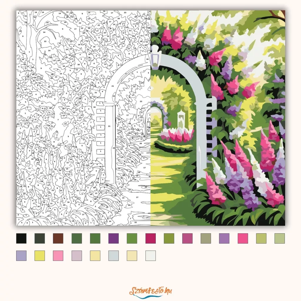 Egy virágokkal sűrűn befuttatott kerti boltív látható, amely egy napsütötte tavaszi kertbe vezet. A kanyargó ösvényt rózsaszín, lila és fehér virágágyások szegélyezik. A kép friss, derűs hangulatot áraszt, mintha egy illatos sétára hívna. Legyen a lakásod dísze vagy egy kedves meglepetés valaki számára – ez a számfestő készlet tökéletes választás mindkettőre. A készletben mindent megtalálsz, amivel lépésről lépésre megalkotható ez a gyönyörű festmény.