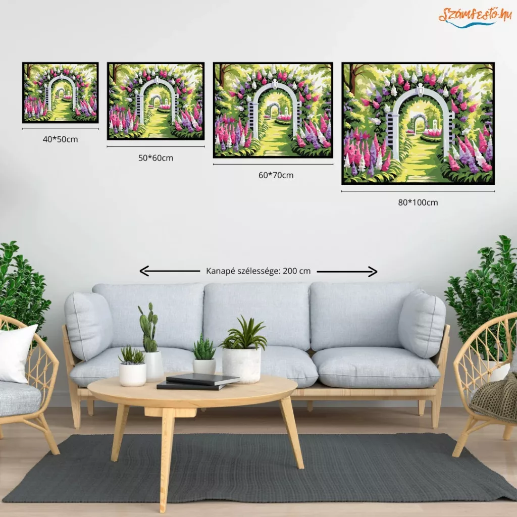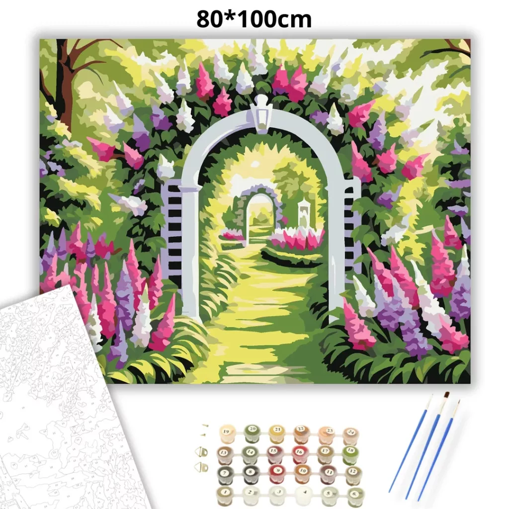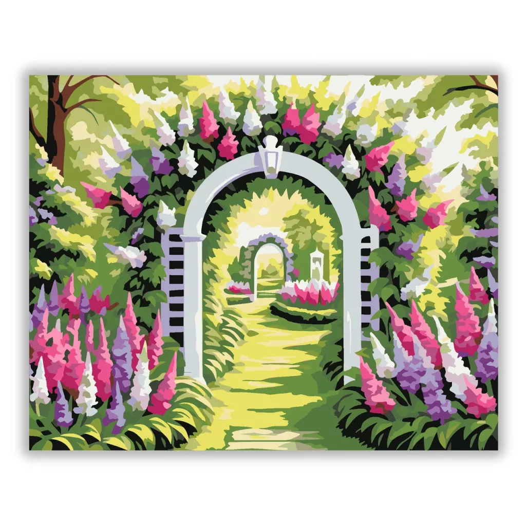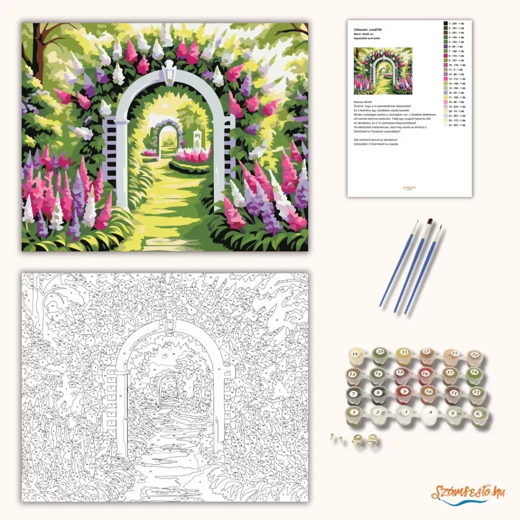 Egy virágokkal sűrűn befuttatott kerti boltív látható, amely egy napsütötte tavaszi kertbe vezet. A kanyargó ösvényt rózsaszín, lila és fehér virágágyások szegélyezik. A kép friss, derűs hangulatot áraszt, mintha egy illatos sétára hívna. Díszítsd otthonodat saját kézzel készített műalkotással, vagy ajándékozd meg szeretteidet egy igazán különleges élménnyel! A számfestő készletben minden szükséges eszköz megtalálható a festmény elkészítéséhez.