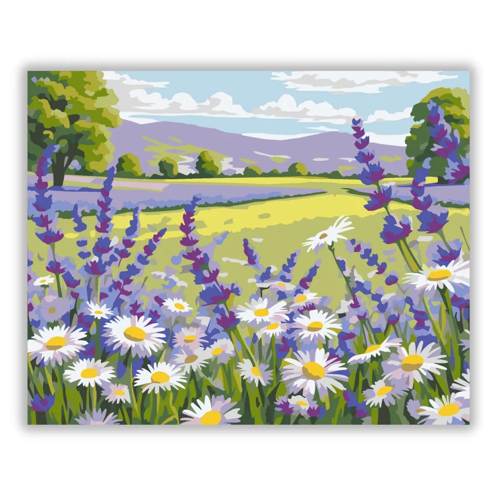 A képen egy tavaszi mező látható, ahol levendula és margaréták nyílnak a napsütésben. A háttérben dombok, fák és felhős ég teszik teljessé a nyugodt tájat. A lila virágok és a fehér szirmok friss, üde hangulatot adnak. Legyen a lakásod dísze vagy egy kedves meglepetés valaki számára – ez a számfestő készlet tökéletes választás mindkettőre. A készletben mindent megtalálsz, amivel lépésről lépésre megalkotható ez a gyönyörű festmény.