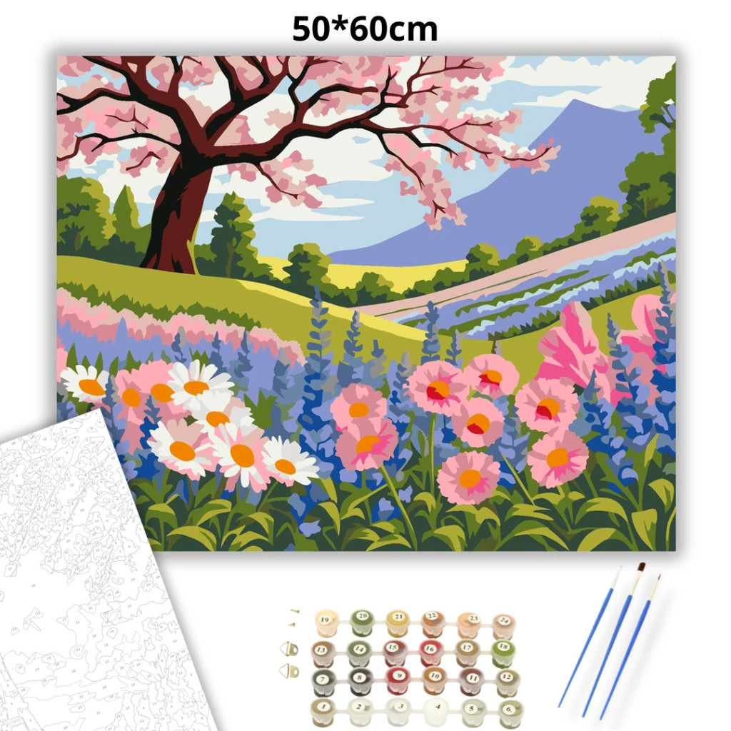 A képen egy tavaszi virágmező látható rózsaszín és fehér virágokkal, köztük magas kék csillagfürtökkel, egy virágzó cseresznyefa alatt. A háttérben zöld dombok, távoli hegyek és egy kanyargó út rajzolódik ki. A látvány friss, napfényes és nyugodt hangulatot áraszt. Engedd szabadjára a kreativitásodat, és alkoss egy különleges műalkotást, amely otthonod dísze lehet de egyedi ajándékként is kiváló. A számfestő készletben minden szükséges eszközt megtalálsz a tökéletes végeredményhez.
