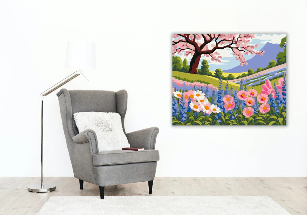 A képen egy tavaszi virágmező látható rózsaszín és fehér virágokkal, köztük magas kék csillagfürtökkel, egy virágzó cseresznyefa alatt. A háttérben zöld dombok, távoli hegyek és egy kanyargó út rajzolódik ki. A látvány friss, napfényes és nyugodt hangulatot áraszt. Engedd szabadjára a kreativitásodat, és alkoss egy különleges műalkotást, amely otthonod dísze lehet de egyedi ajándékként is kiváló. A számfestő készletben minden szükséges eszközt megtalálsz a tökéletes végeredményhez.