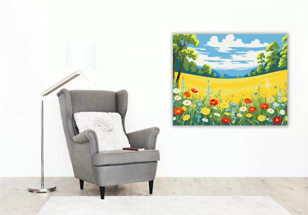 A képen egy tavaszi rét látható, tele vadvirágokkal, a háttérben dombokkal és távoli hegyekkel. A mezőn pipacsok, margaréták és apró kék virágok nyílnak a fű között. A világos ég és a puha felhők nyugodt, napfényes hangulatot adnak. Engedd szabadjára a kreativitásodat, és alkoss egy különleges műalkotást, amely otthonod dísze lehet de egyedi ajándékként is kiváló. A számfestő készletben minden szükséges eszközt megtalálsz a tökéletes végeredményhez.