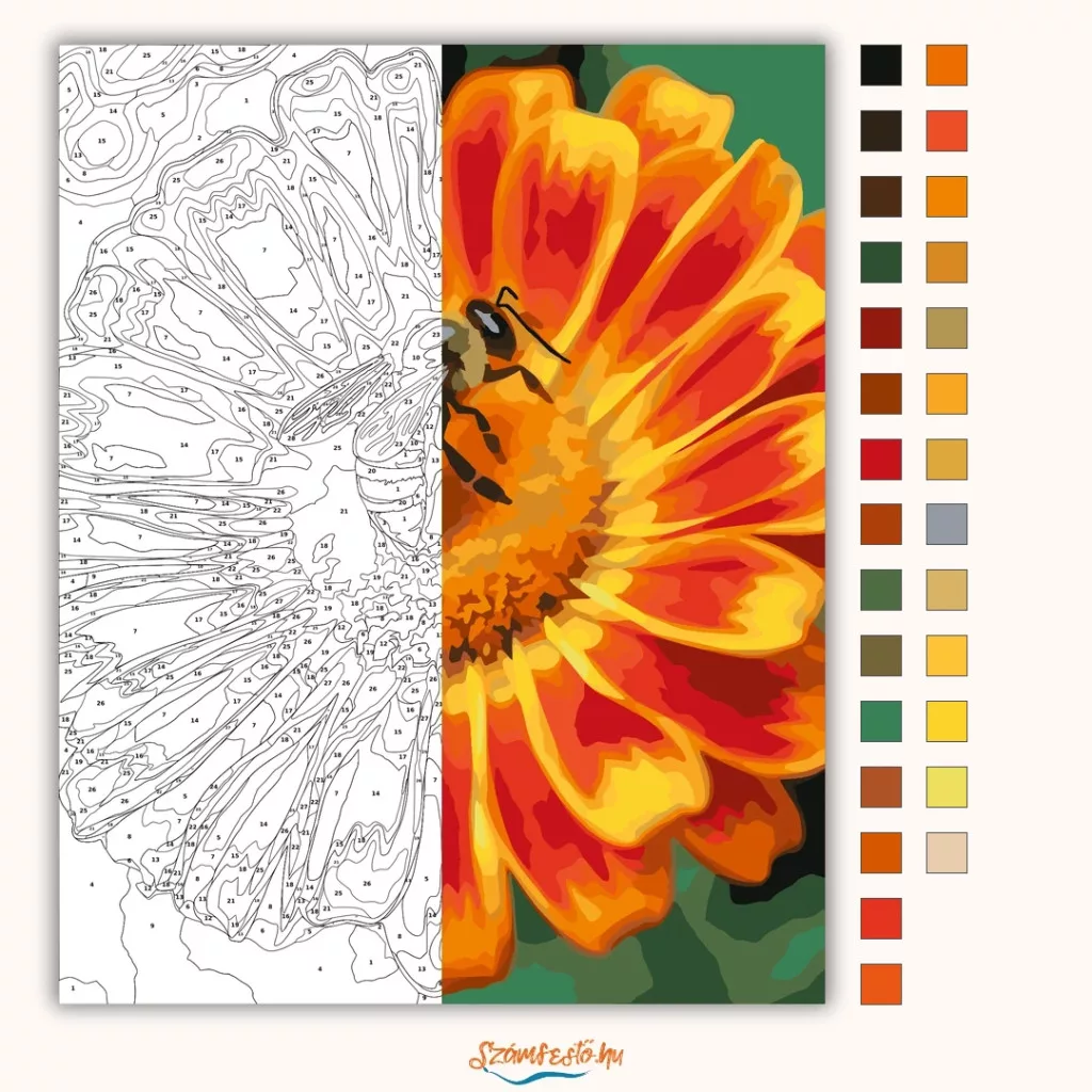 A képen egy méh látható, ahogy egy nyíló bársonyvirág közepébe bújik. A sziromlevelek élénk, napfényes árnyalatai és a közeli nézet friss, tavaszi hangulatot adnak. Látványos, természetközeli kép, amely azonnal odavonzza a tekintetet. Engedd szabadjára a kreativitásodat, és alkoss egy különleges műalkotást, amely otthonod dísze lehet de egyedi ajándékként is kiváló. A számfestő készletben minden szükséges eszközt megtalálsz a tökéletes végeredményhez.