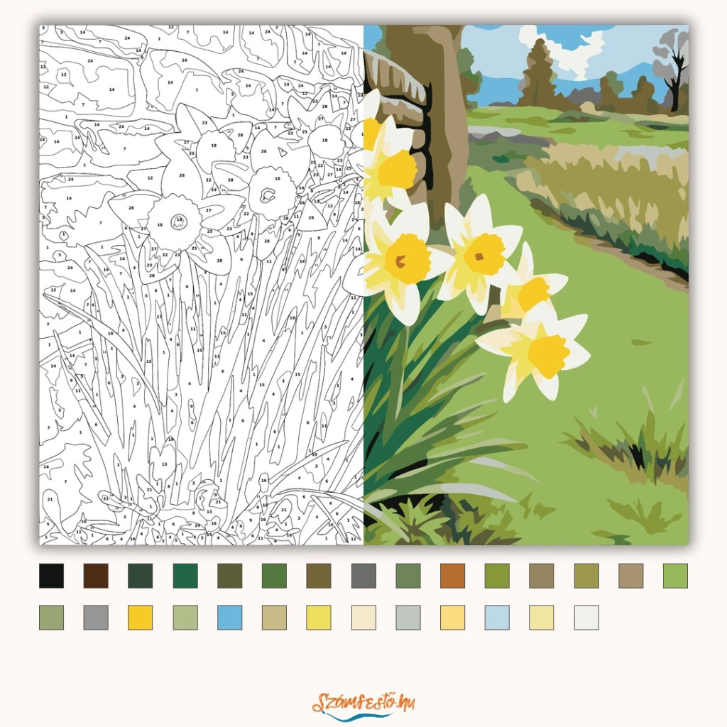 A képen tavaszi nárciszok nyílnak egy kőfal tövében, sűrű zöld levelek között. A virágok fehér szirmai és napsárga közepe friss, üde hangulatot ad. A háttérben egy zöld mező és távoli fák teszik teljessé a nyugodt vidéki látványt. Ez a számfestő készlet tökéletes választás, ha egyedi dekorációval tennéd szebbé otthonodat, vagy ha különleges ajándékot keresel. A csomagban minden megtalálható, amire a festéshez szükséged van.