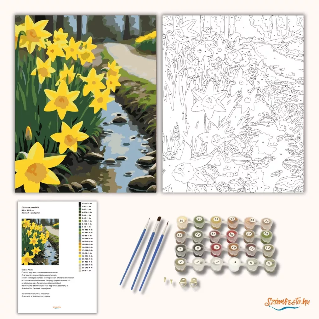 A képen közeli nárciszok nyílnak egy út menti árok partján, mellettük keskeny patak csordogál kövekkel szegélyezve. A háttérben erdős rész és egy kanyargó út látható. Friss, tavaszi hangulatot áraszt, élénk virágokkal és nyugodt természeti részletekkel. Ez a számfestő készlet tökéletes választás, ha egyedi dekorációval tennéd szebbé otthonodat, vagy ha különleges ajándékot keresel. A csomagban minden megtalálható, amire a festéshez szükséged van.