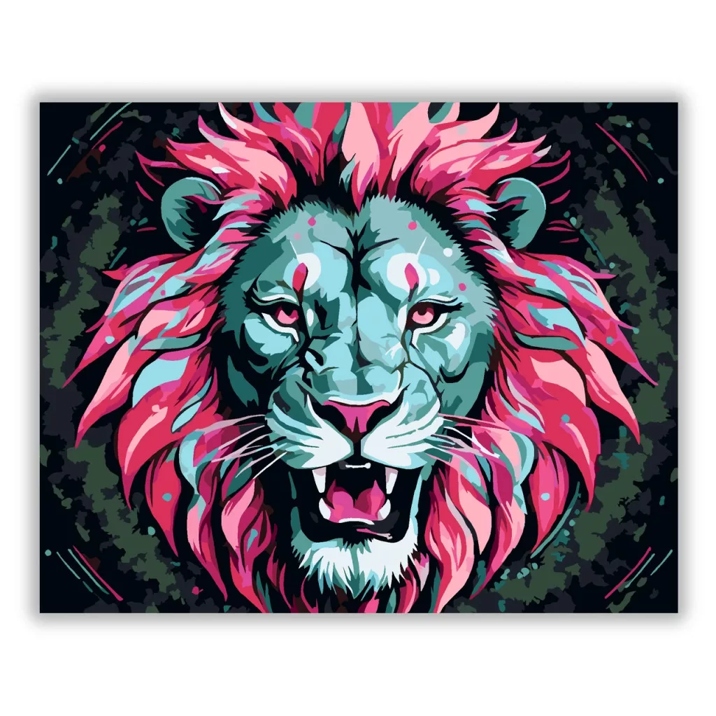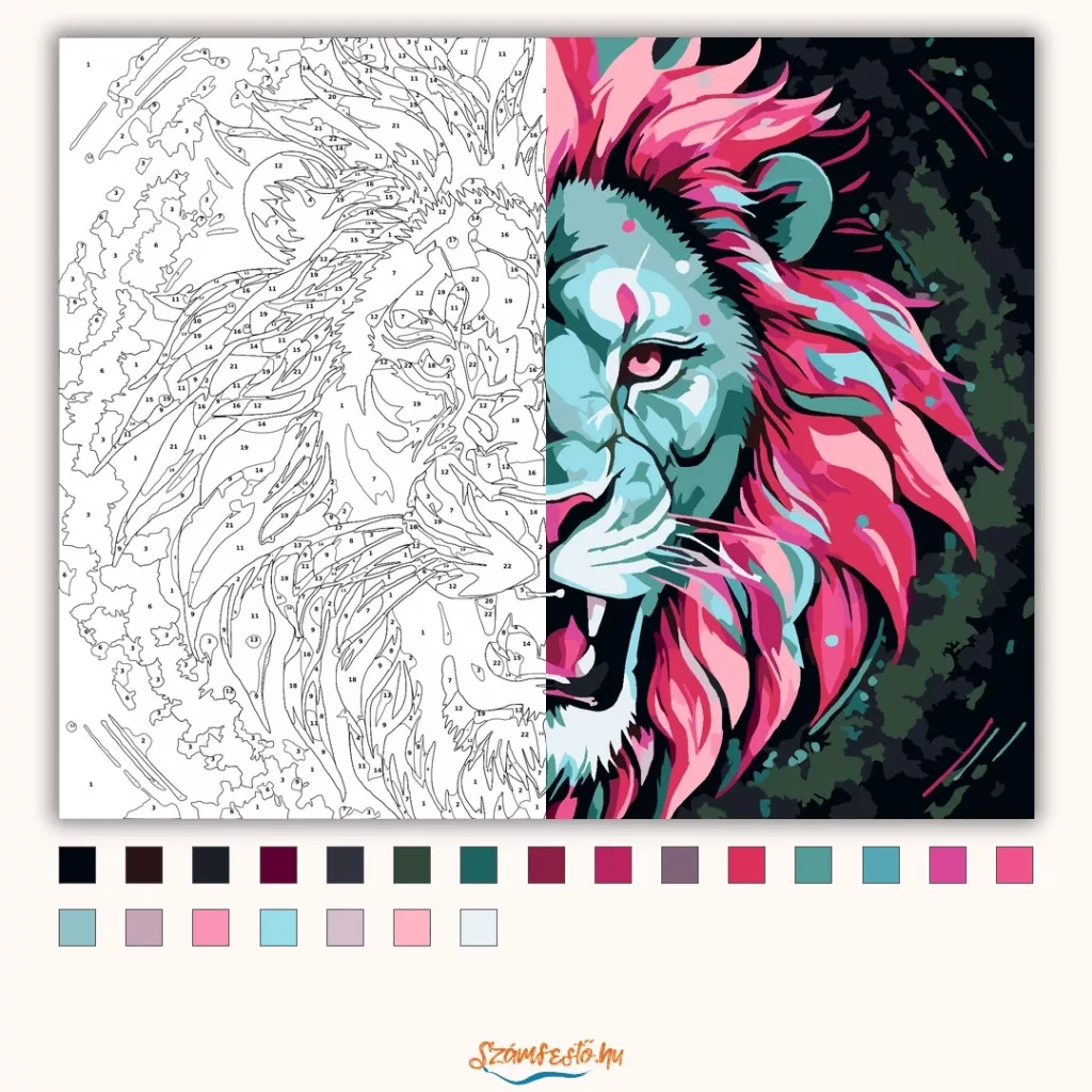 A képen egy ordító oroszlán feje látható, középen, erőteljes tekintettel és nyitott szájjal. A sörény élénk rózsaszín és türkiz árnyalatokban ragyog, a háttérben pöttyös minták és csillagszerű villanások jelennek meg. Látványos, energikus kép, ami azonnal magára vonja a figyelmet. Legyen a lakásod dísze vagy egy kedves meglepetés valaki számára – ez a számfestő készlet tökéletes választás mindkettőre. A készletben mindent megtalálsz, amivel lépésről lépésre megalkotható ez a gyönyörű festmény.