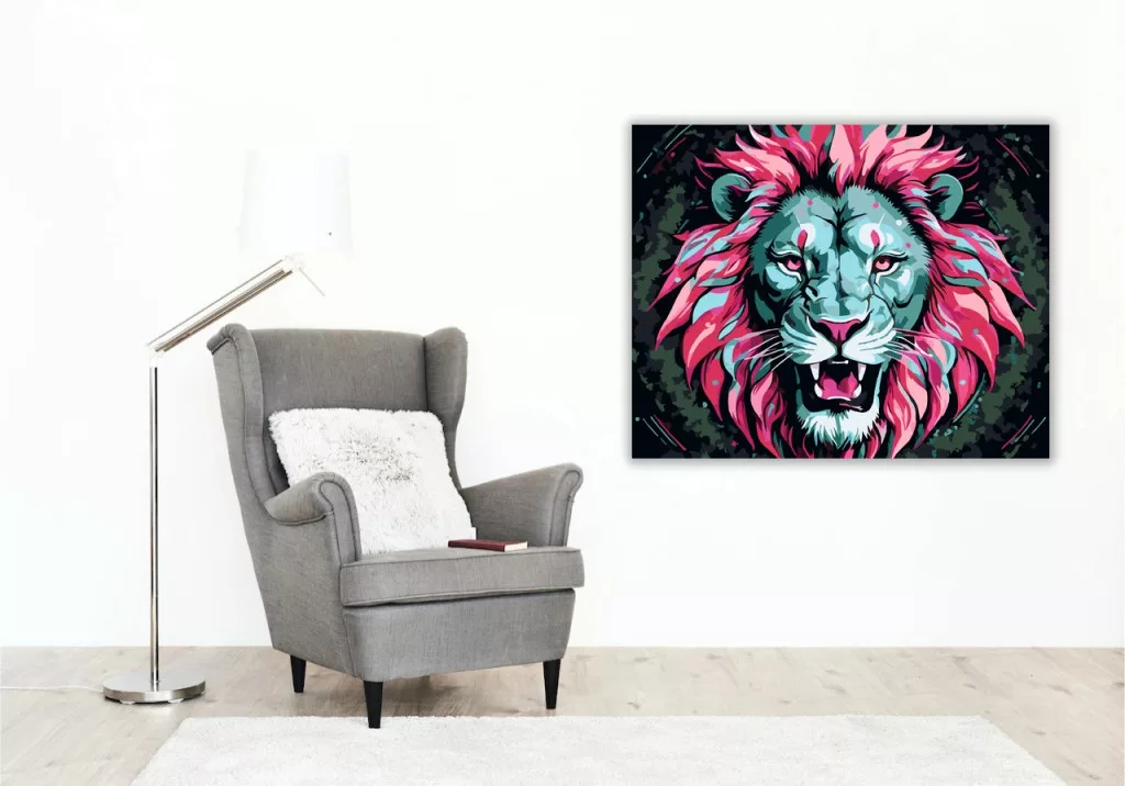 A képen egy ordító oroszlán feje látható, középen, erőteljes tekintettel és nyitott szájjal. A sörény élénk rózsaszín és türkiz árnyalatokban ragyog, a háttérben pöttyös minták és csillagszerű villanások jelennek meg. Látványos, energikus kép, ami azonnal magára vonja a figyelmet. Legyen a lakásod dísze vagy egy kedves meglepetés valaki számára – ez a számfestő készlet tökéletes választás mindkettőre. A készletben mindent megtalálsz, amivel lépésről lépésre megalkotható ez a gyönyörű festmény.