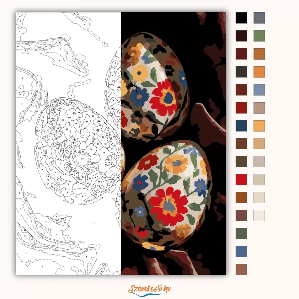 A képen három díszített tojás látható, mindegyiken virágmintákkal és pettyes részletekkel. A sötét háttérből szépen kiemelkednek a minták, így a kép egyszerre ünnepi és meghitt hangulatú. A virágok és levelek gazdag díszítése különleges, népi jellegű látványt ad. Díszítsd otthonodat saját kézzel készített műalkotással, vagy ajándékozd meg szeretteidet egy igazán különleges élménnyel! A számfestő készletben minden szükséges eszköz megtalálható a festmény elkészítéséhez.