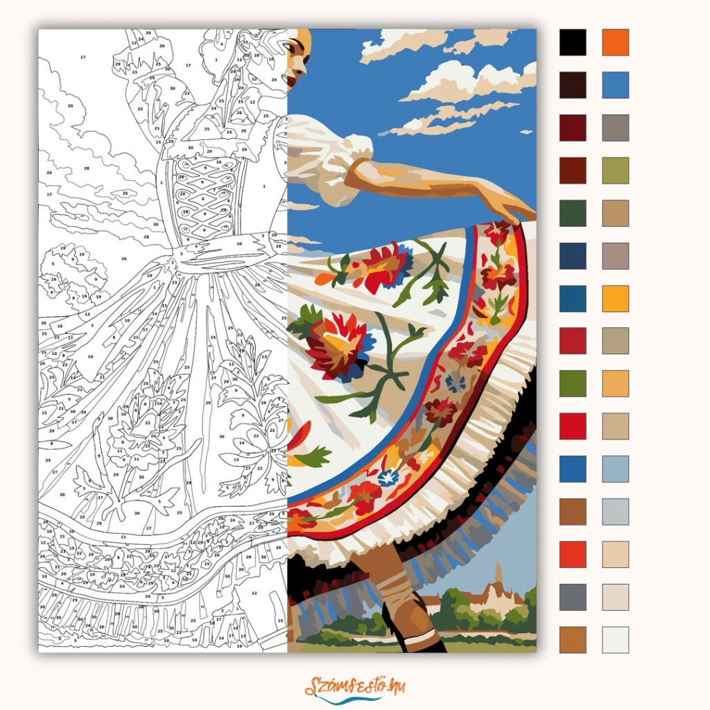 A képen egy magyar néptáncos nő látható, karjait kinyújtva, lendületes mozdulat közben. A hímzett, virágmintás szoknya és a piros öv vidám, ünnepi hangulatot ad. A háttérben kék ég, fehér felhők és távoli táj látszik. Díszítsd otthonodat saját kézzel készített műalkotással, vagy ajándékozd meg szeretteidet egy igazán különleges élménnyel! A számfestő készletben minden szükséges eszköz megtalálható a festmény elkészítéséhez.