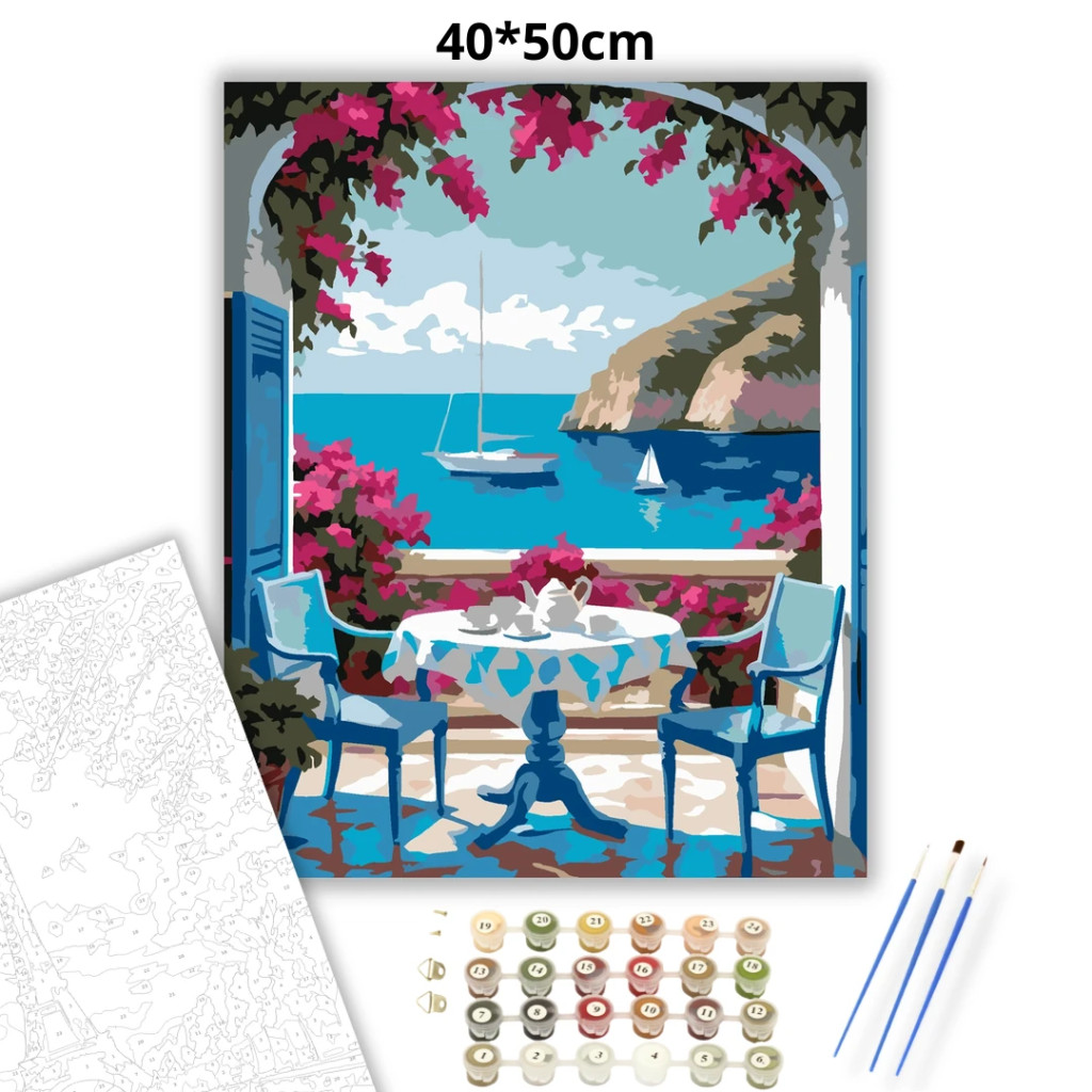 Egy tengerre néző teraszon egy kerek asztal áll teáskannával és csészékkel, két székkel körülötte. A nyugodt vízen egy nagyobb vitorlás és egy kisebb vitorlás látható, a háttérben sziklás parttal. A jelenetet élénk rózsaszín virágok és zöld levelek keretezik, friss, nyári hangulattal. Legyen a lakásod dísze vagy egy kedves meglepetés valaki számára – ez a számfestő készlet tökéletes választás mindkettőre. A készletben mindent megtalálsz, amivel lépésről lépésre megalkotható ez a gyönyörű festmény.