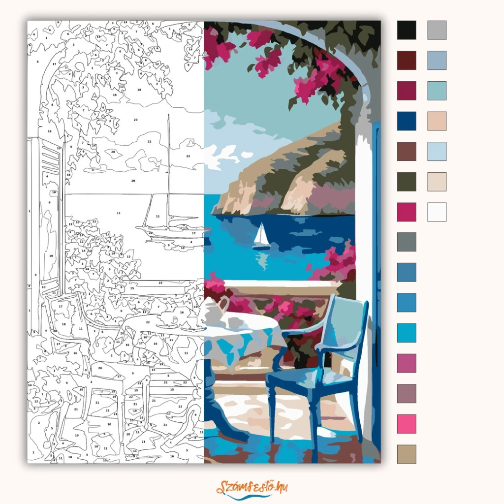 Egy tengerre néző teraszon egy kerek asztal áll teáskannával és csészékkel, két székkel körülötte. A nyugodt vízen egy nagyobb vitorlás és egy kisebb vitorlás látható, a háttérben sziklás parttal. A jelenetet élénk rózsaszín virágok és zöld levelek keretezik, friss, nyári hangulattal. Varázsolj egyedi hangulatot otthonodba ezzel a gyönyörű számfestő készlettel, amely tökéletes ajándék is lehet szeretteid számára. A csomag mindent tartalmaz, amire szükséged van ahhoz, hogy saját kezűleg alkoss egy lenyűgöző festményt.