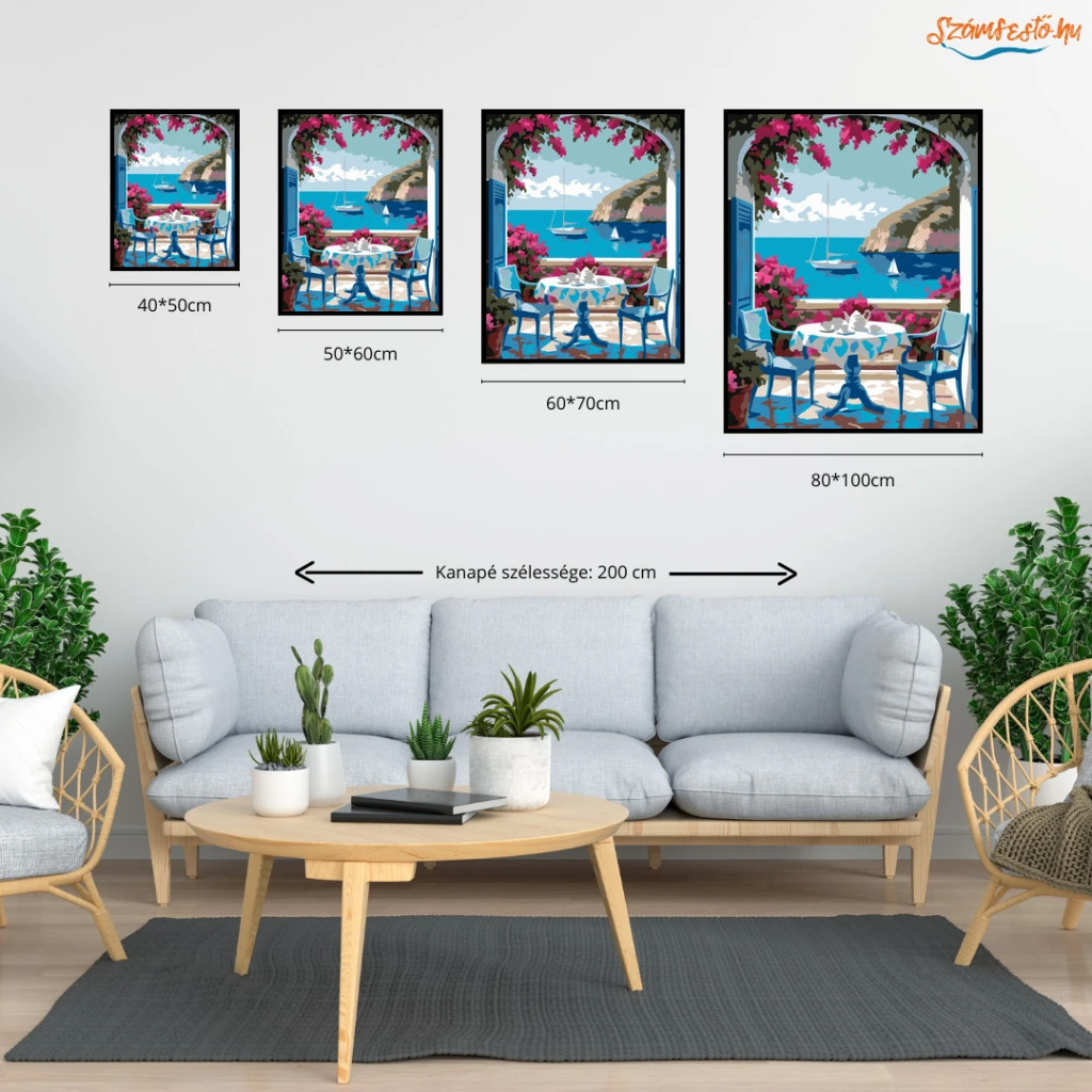 Egy tengerre néző teraszon egy kerek asztal áll teáskannával és csészékkel, két székkel körülötte. A nyugodt vízen egy nagyobb vitorlás és egy kisebb vitorlás látható, a háttérben sziklás parttal. A jelenetet élénk rózsaszín virágok és zöld levelek keretezik, friss, nyári hangulattal. Legyen a lakásod dísze vagy egy kedves meglepetés valaki számára – ez a számfestő készlet tökéletes választás mindkettőre. A készletben mindent megtalálsz, amivel lépésről lépésre megalkotható ez a gyönyörű festmény.