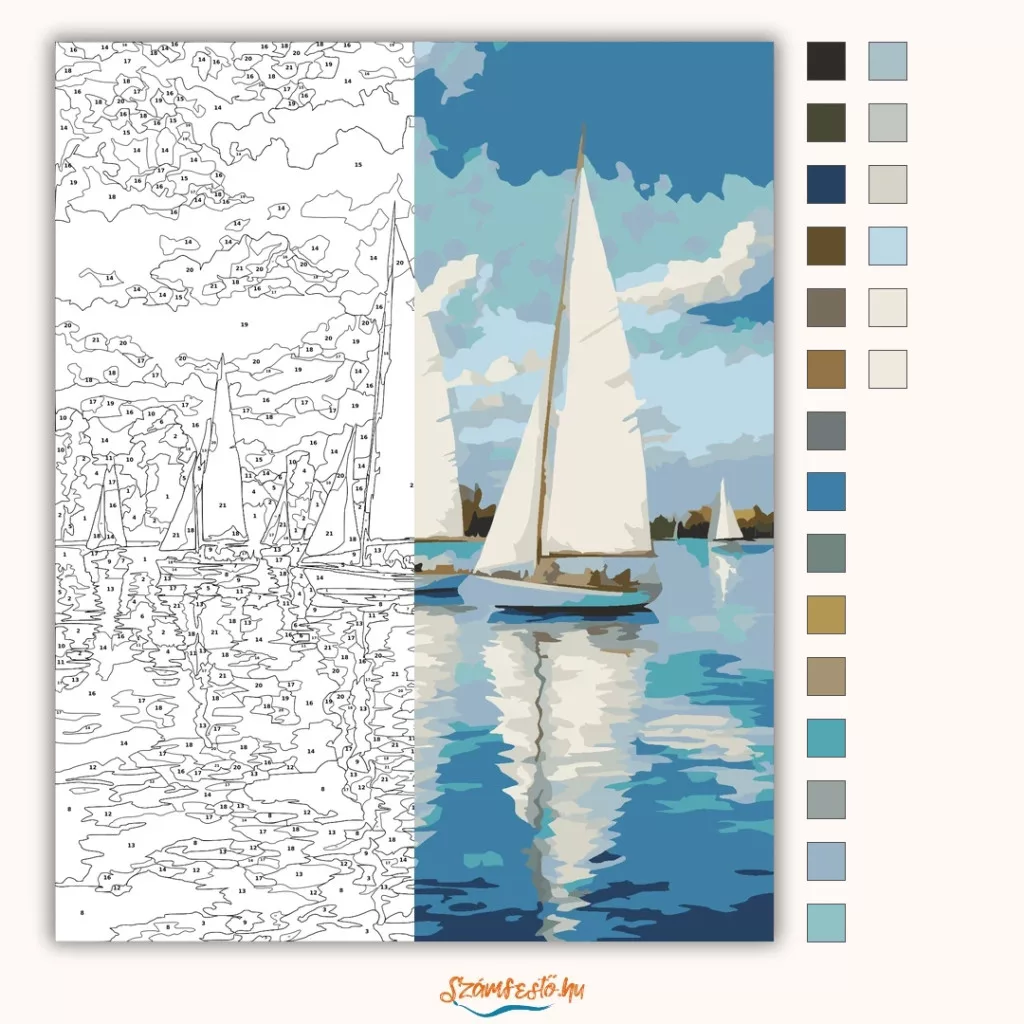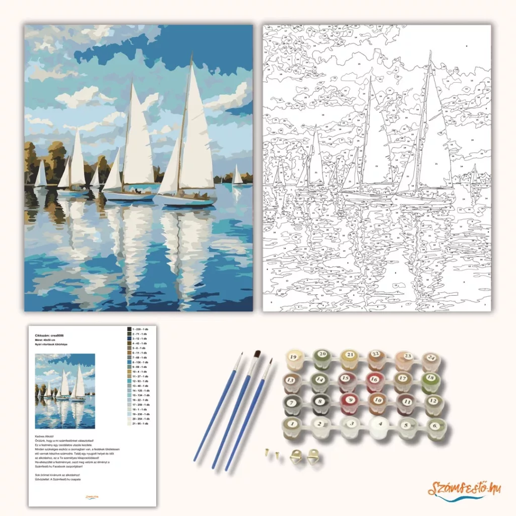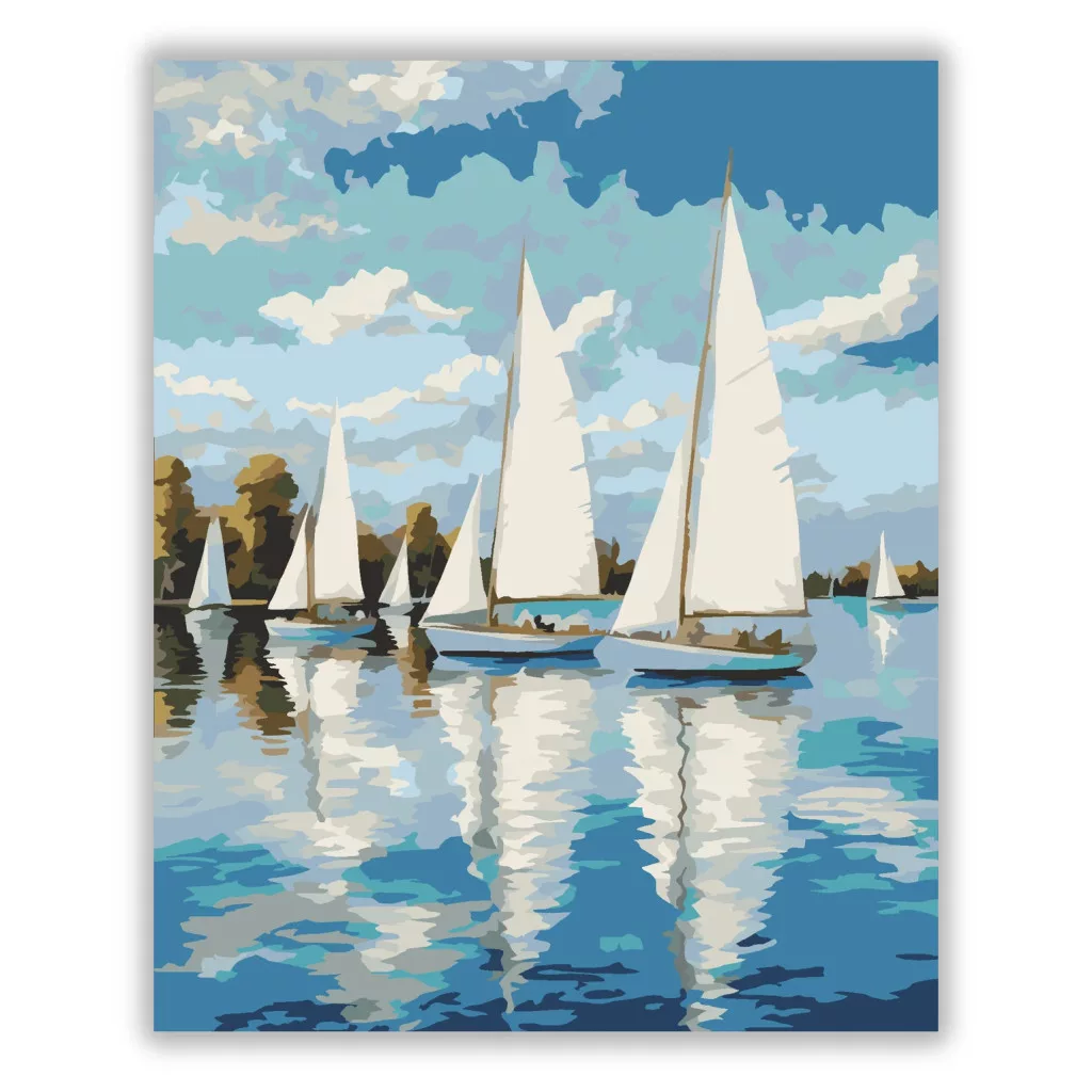 A képen több vitorlás hajó látható nyugodt vízen, nagy fehér vitorlákkal. A víz felszínén tükröződnek a hajók és a felhős égbolt. A háttérben fák sora zárja a látványt, összességében csendes, nyári hangulatot áraszt. Legyen a lakásod dísze vagy egy kedves meglepetés valaki számára – ez a számfestő készlet tökéletes választás mindkettőre. A készletben mindent megtalálsz, amivel lépésről lépésre megalkotható ez a gyönyörű festmény.