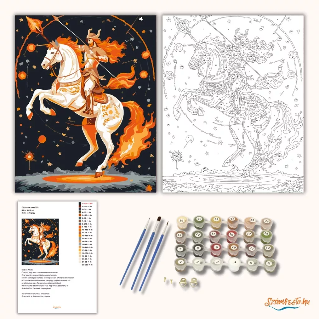 A képen a Nyilas jegy alakja látható: egy vágtató lovas, kifeszített íjjal és előre tartott nyíllal, lángnyelvek között. A sötét égbolton csillagok és körkörös, sugárzó motívumok veszik körül, amit a tüzes narancs árnyalatok tesznek igazán lendületessé. Erőteljes, látványos kép, ami azonnal magára vonja a tekintetet. Legyen a lakásod dísze vagy egy kedves meglepetés valaki számára – ez a számfestő készlet tökéletes választás mindkettőre. A készletben mindent megtalálsz, amivel lépésről lépésre megalkotható ez a gyönyörű festmény.