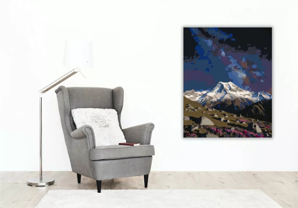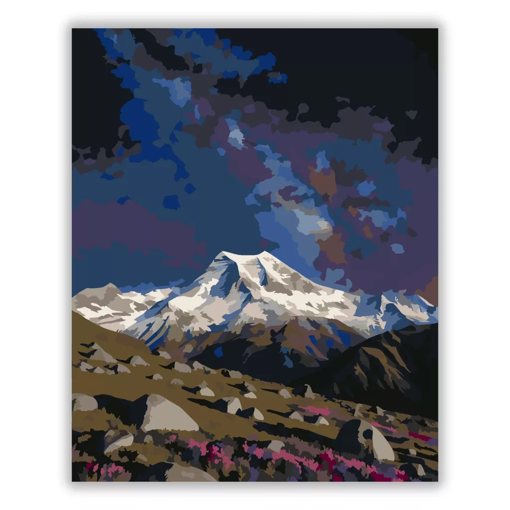 A képen a Mount Aoraki hófödte csúcsa magasodik a táj fölé, előtte köves hegyoldalakkal és alacsony bokrokkal. Fent sötét, csillagokkal teli égbolt terül el, ami különösen nyugodt, esti hangulatot ad. A mély kékek és a hegyek világos havas részei erős, látványos kontrasztot teremtenek. Díszítsd otthonodat saját kézzel készített műalkotással, vagy ajándékozd meg szeretteidet egy igazán különleges élménnyel! A számfestő készletben minden szükséges eszköz megtalálható a festmény elkészítéséhez.