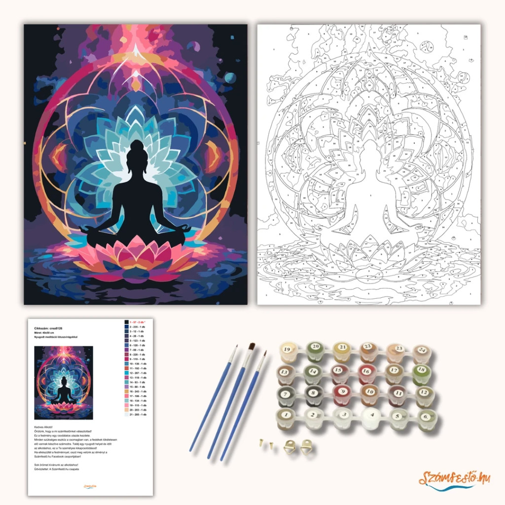 A képen egy ülő ember sziluettje látható egy lótuszvirágon, a kezei a térdén nyugszanak. Mögötte egy nagy, réteges lótuszforma és körkörös, íves minták rajzolódnak ki. A sötét háttérből élénk, ragyogó részletek emelkednek ki, nyugodt, meditatív hangulatot keltve. Legyen a lakásod dísze vagy egy kedves meglepetés valaki számára – ez a számfestő készlet tökéletes választás mindkettőre. A készletben mindent megtalálsz, amivel lépésről lépésre megalkotható ez a gyönyörű festmény.