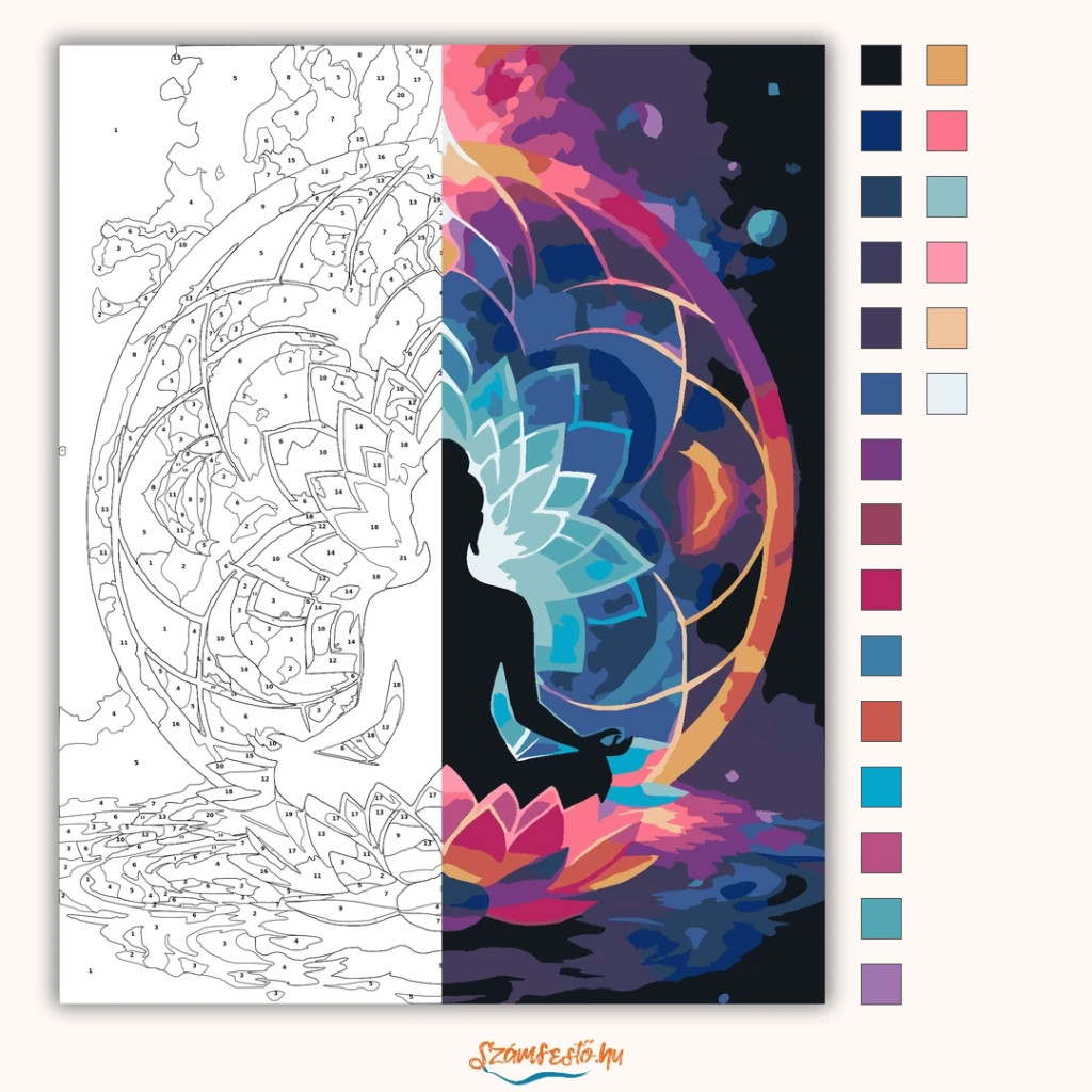A képen egy ülő ember sziluettje látható egy lótuszvirágon, a kezei a térdén nyugszanak. Mögötte egy nagy, réteges lótuszforma és körkörös, íves minták rajzolódnak ki. A sötét háttérből élénk, ragyogó részletek emelkednek ki, nyugodt, meditatív hangulatot keltve. Varázsolj egyedi hangulatot otthonodba ezzel a gyönyörű számfestő készlettel, amely tökéletes ajándék is lehet szeretteid számára. A csomag mindent tartalmaz, amire szükséged van ahhoz, hogy saját kezűleg alkoss egy lenyűgöző festményt.