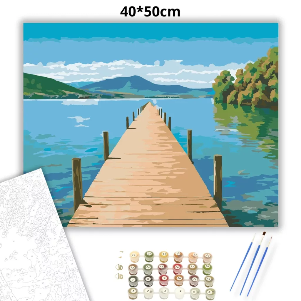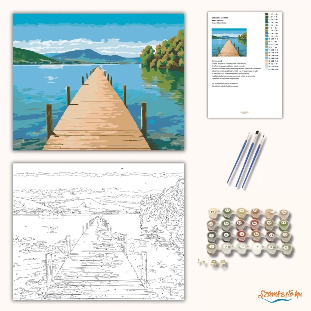 A képen egy hosszú fa stég nyúlik be a nyugodt tó vizébe, a távolban dombokkal. A víz tükröződései és a felhős ég csendes, pihentető hangulatot adnak. A jobb oldalon fás partszakasz zárja a látványt. Legyen a lakásod dísze vagy egy kedves meglepetés valaki számára – ez a számfestő készlet tökéletes választás mindkettőre. A készletben mindent megtalálsz, amivel lépésről lépésre megalkotható ez a gyönyörű festmény.