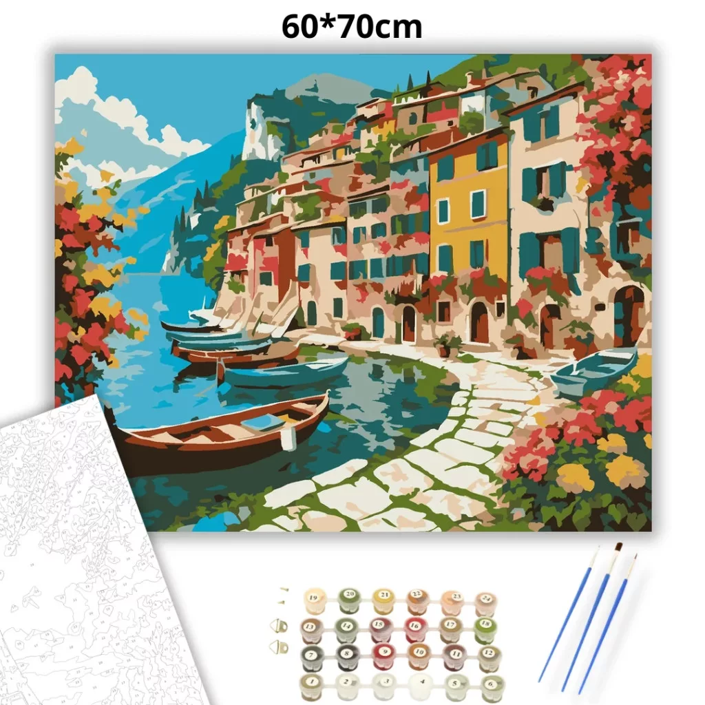 Olasz tóparti falu - számfestő készlet - Számfestő.hu - 60×70cm - Keret nélkül